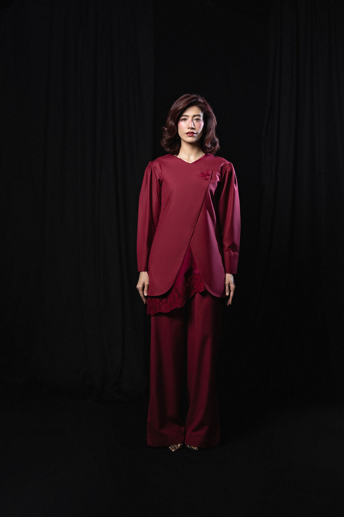 Crimson Fold is crafted in structured tropical suiting, cut with a clean, architectural line with...
