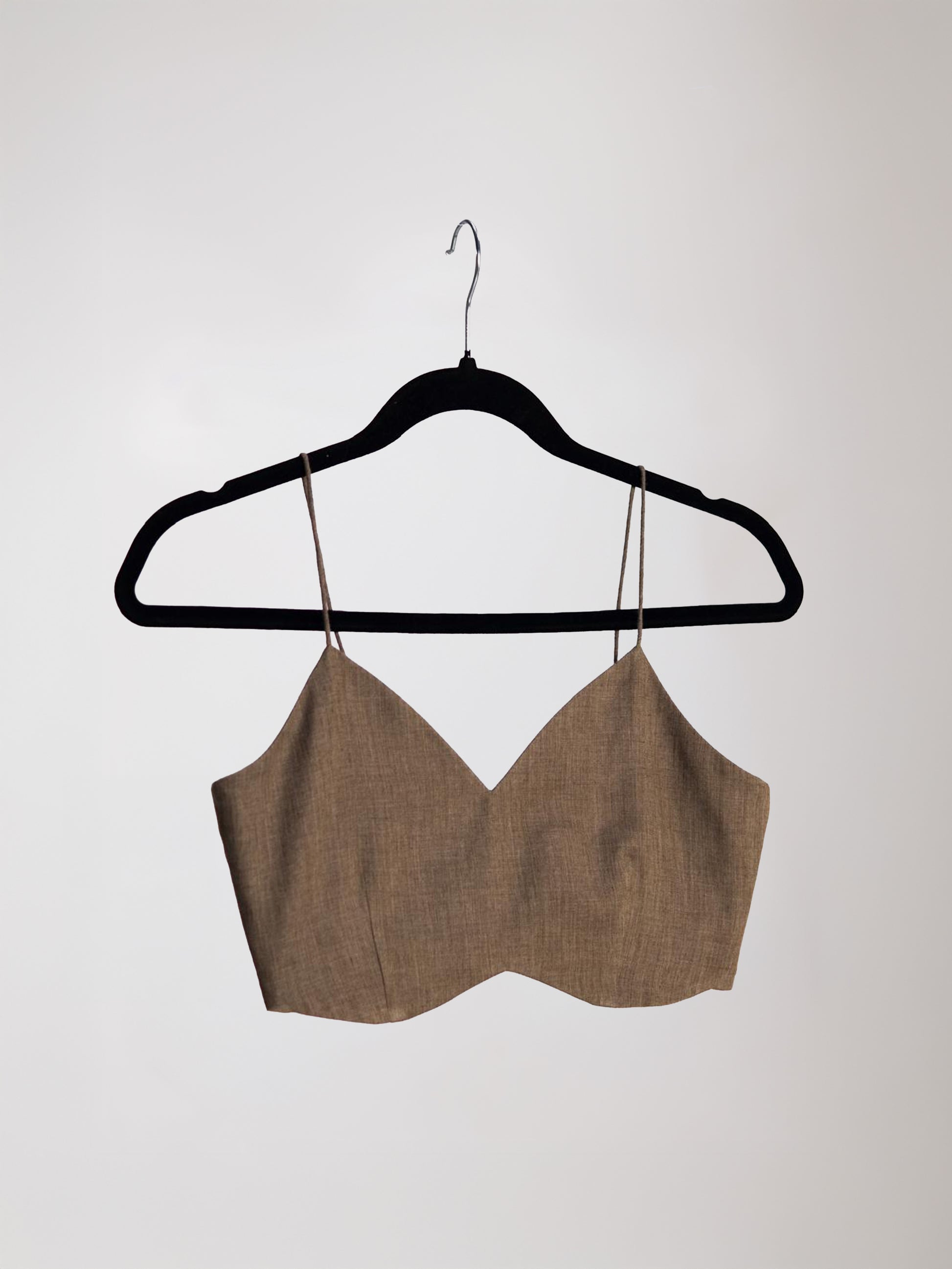 A minimal cropped cami in earthy olive with delicate straps and a sculpted neckline. Clean and effortless, it stands on its own or layers seamlessly under shirts and blazers.