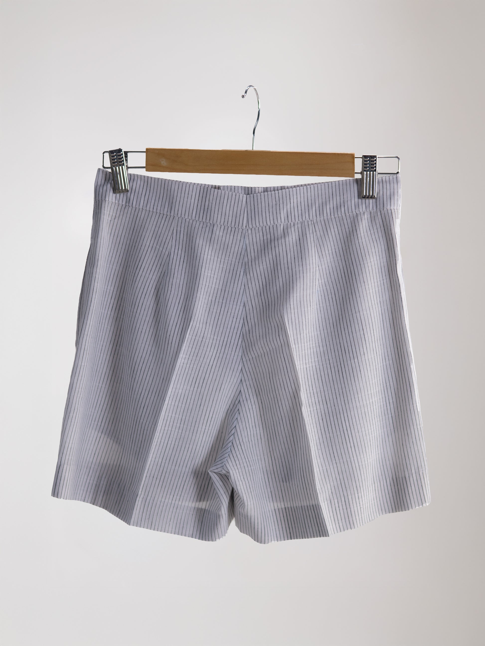 Tailored high-waist shorts in black-and-white pinstripes, finished with front pleats for structure. A staple that blends crisp tailoring with summer ease — smart enough to dress up, easy enough to wear on repeat.