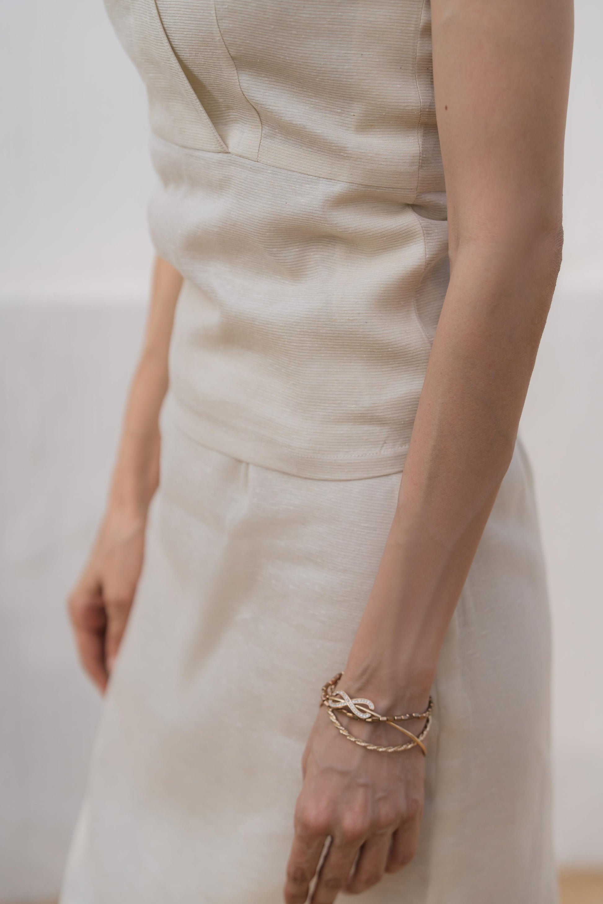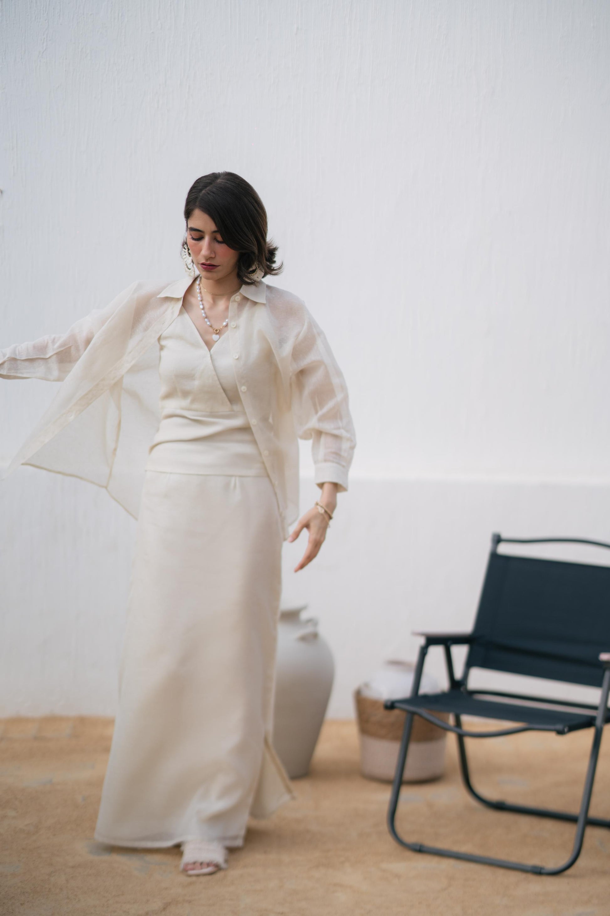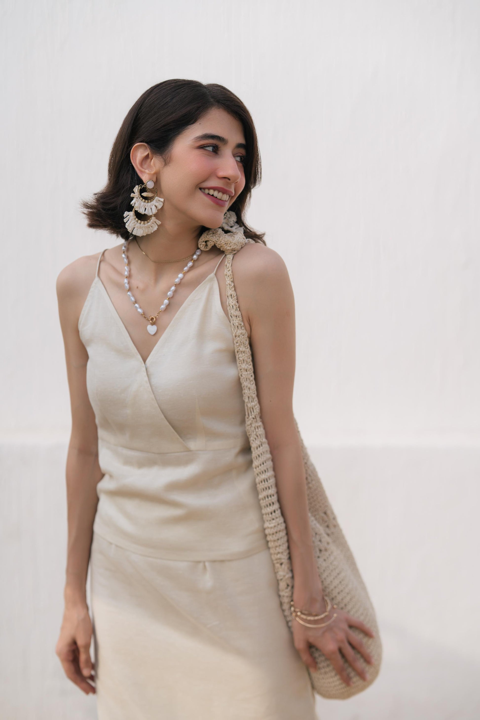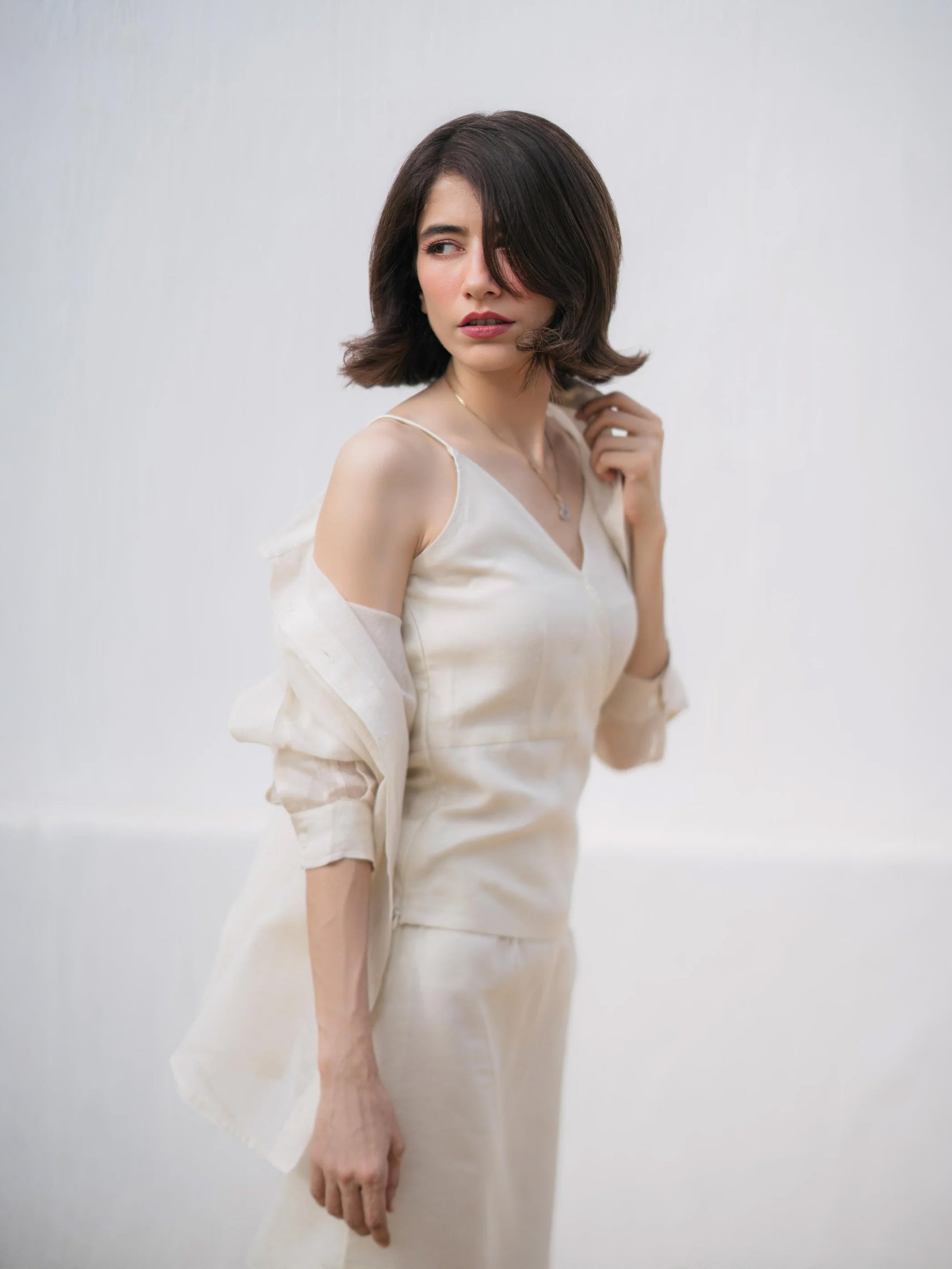 A barely-there tank top with a wrap neckline and delicate straps — this piece balances feminine lines with everyday ease. Crafted in corduroy khaddi and rendered in a warm ivory tone, it’s made for days that start with sunlight and end with nothing planned.