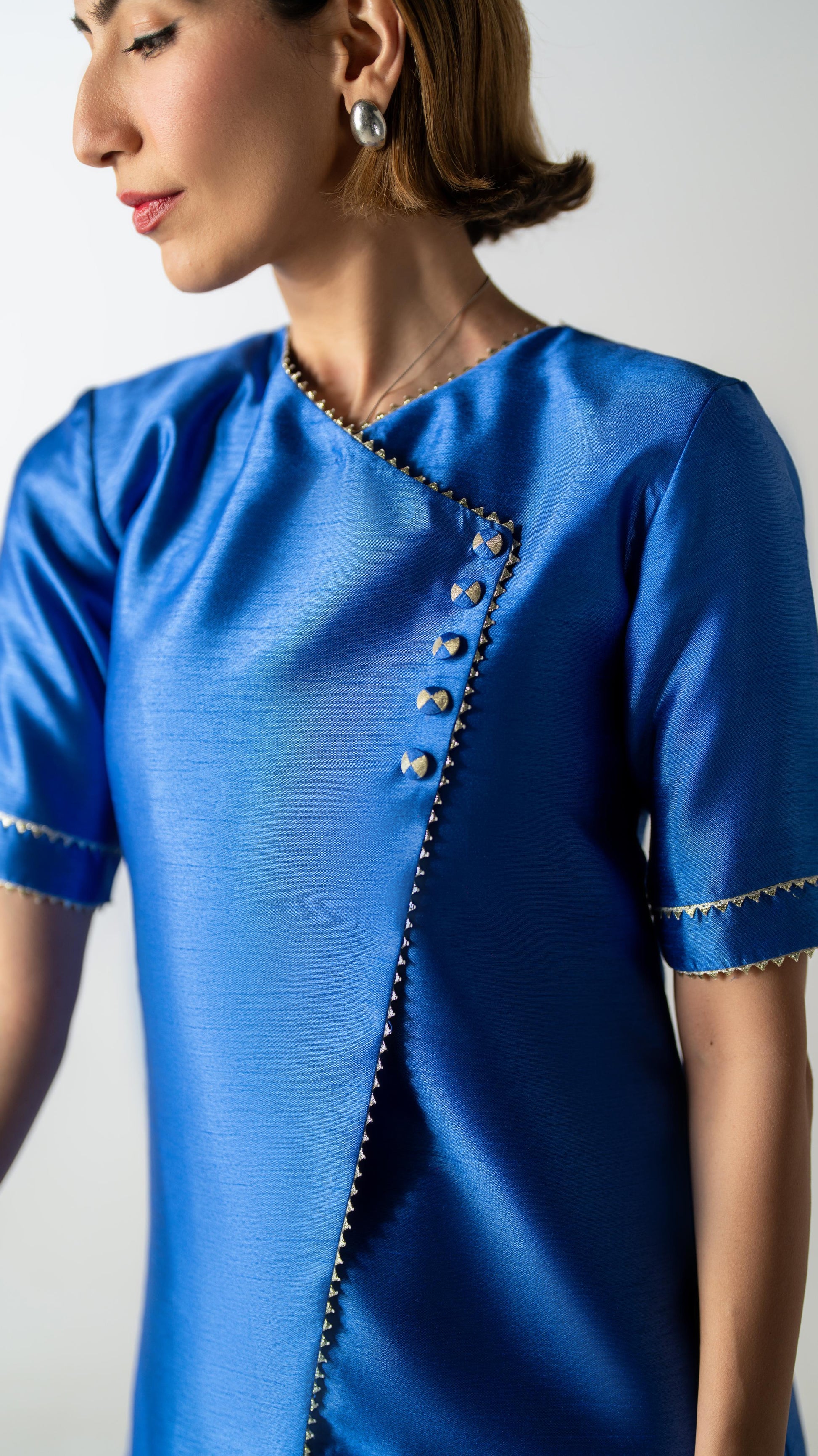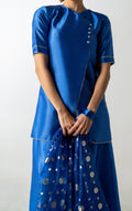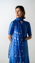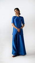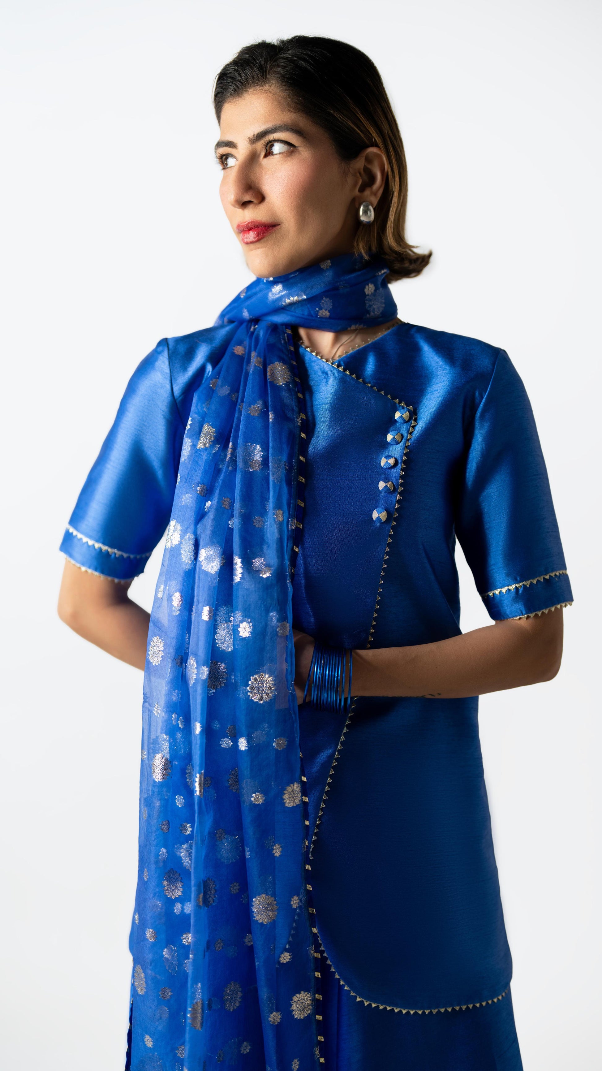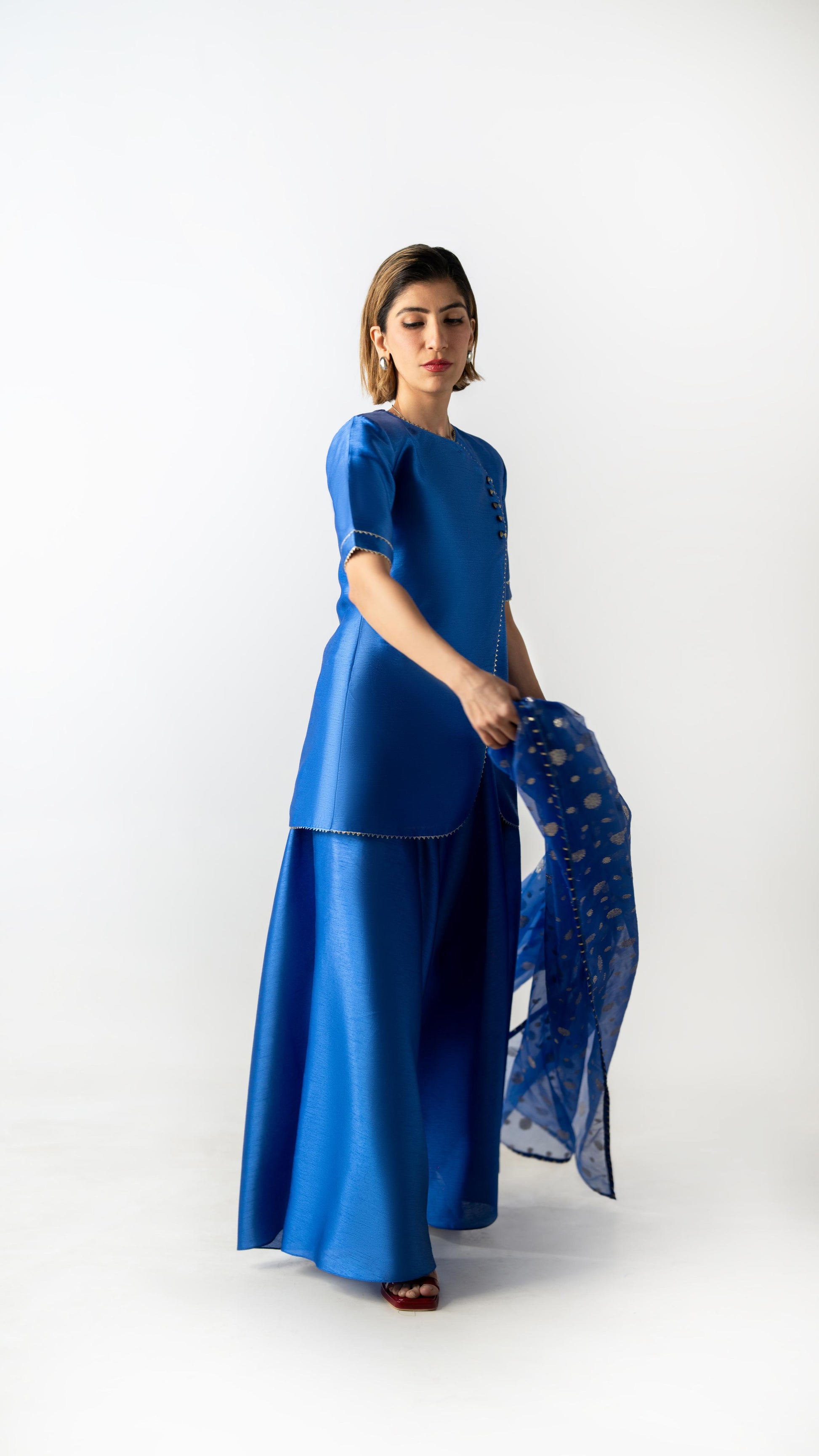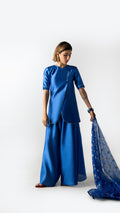 Crafted in Chinese raw silk, Blue Hour Fold reinterprets the signature fold with a clean, architectural line. Rendered in true blue, the look is paired with fluid wide-leg pants and finished with a sheer patterned dupatta that adds lightness without interruption. Calm, precise, and quietly modern.