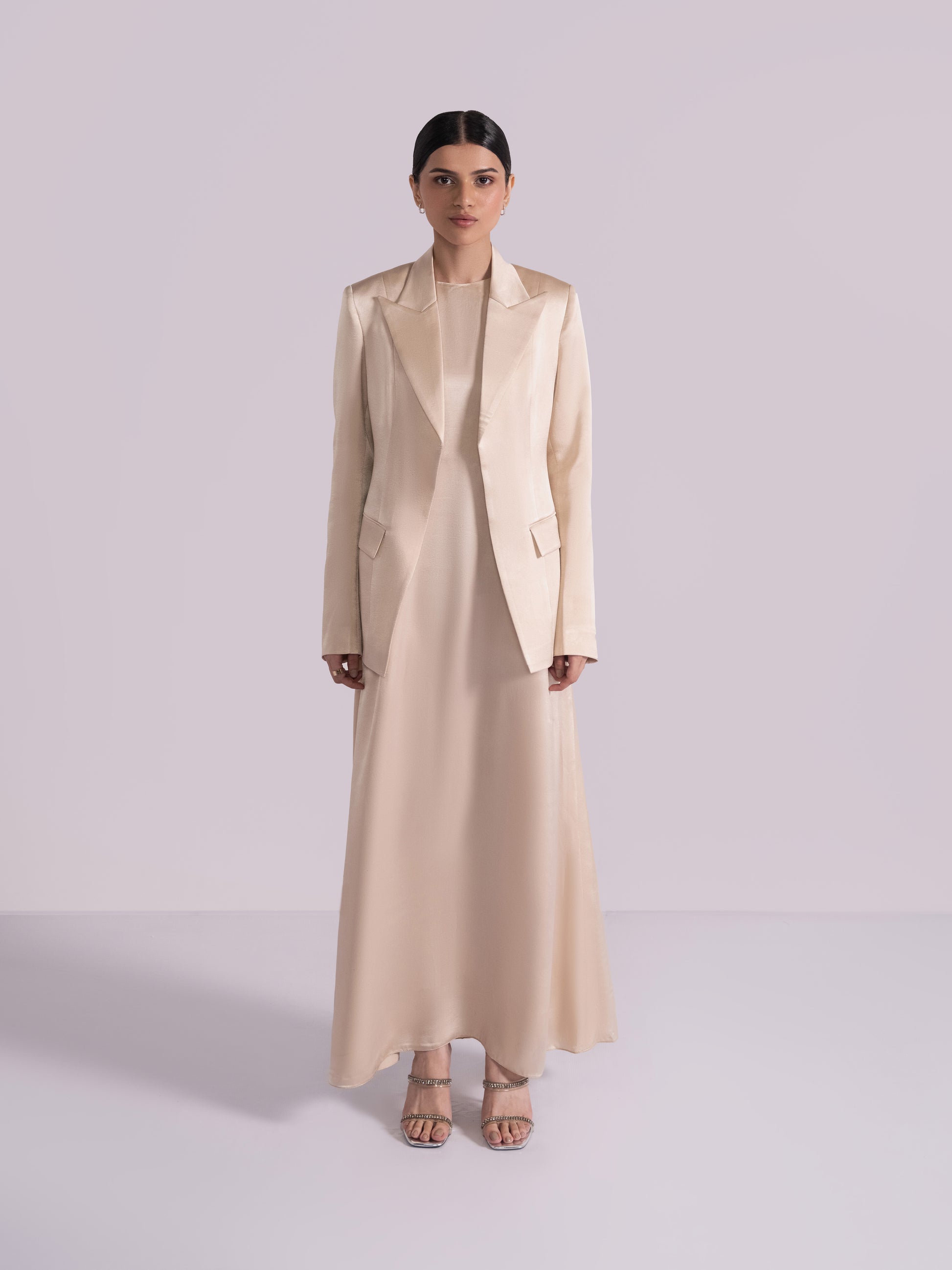 As the name suggests, this look truly encapsulates that “easy, breezy, beautiful cover-girl” aura! A relaxed-fit blazer paired with a majestic silk maxi dress, designed with a round neck and line of decorative buttons down one side, keeps this ensemble simple, sophisticated and versatile in transitioning from casual to formal. So whether you pop open the bubbly or kick back with friends, this girl is ready to be the life of the party!