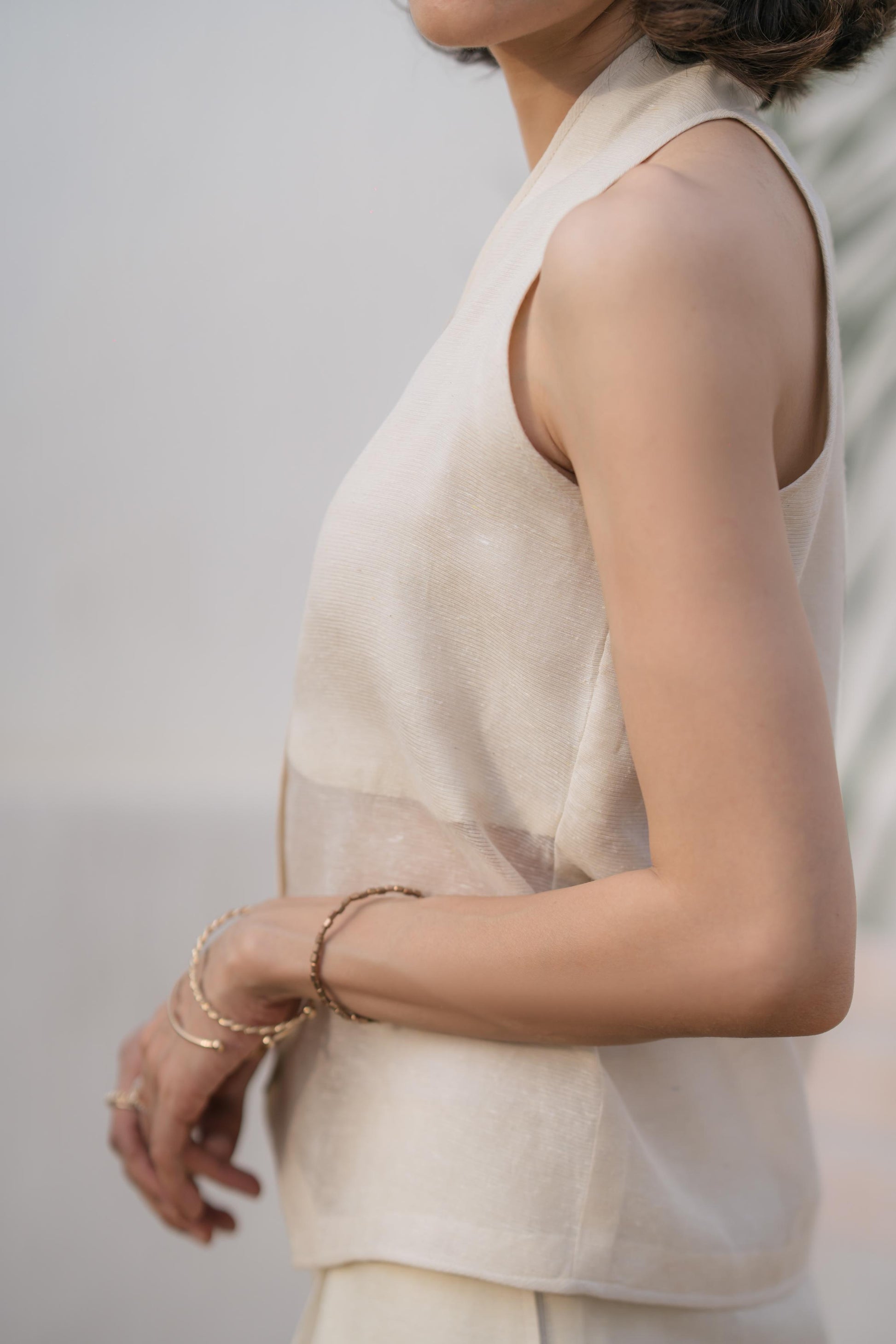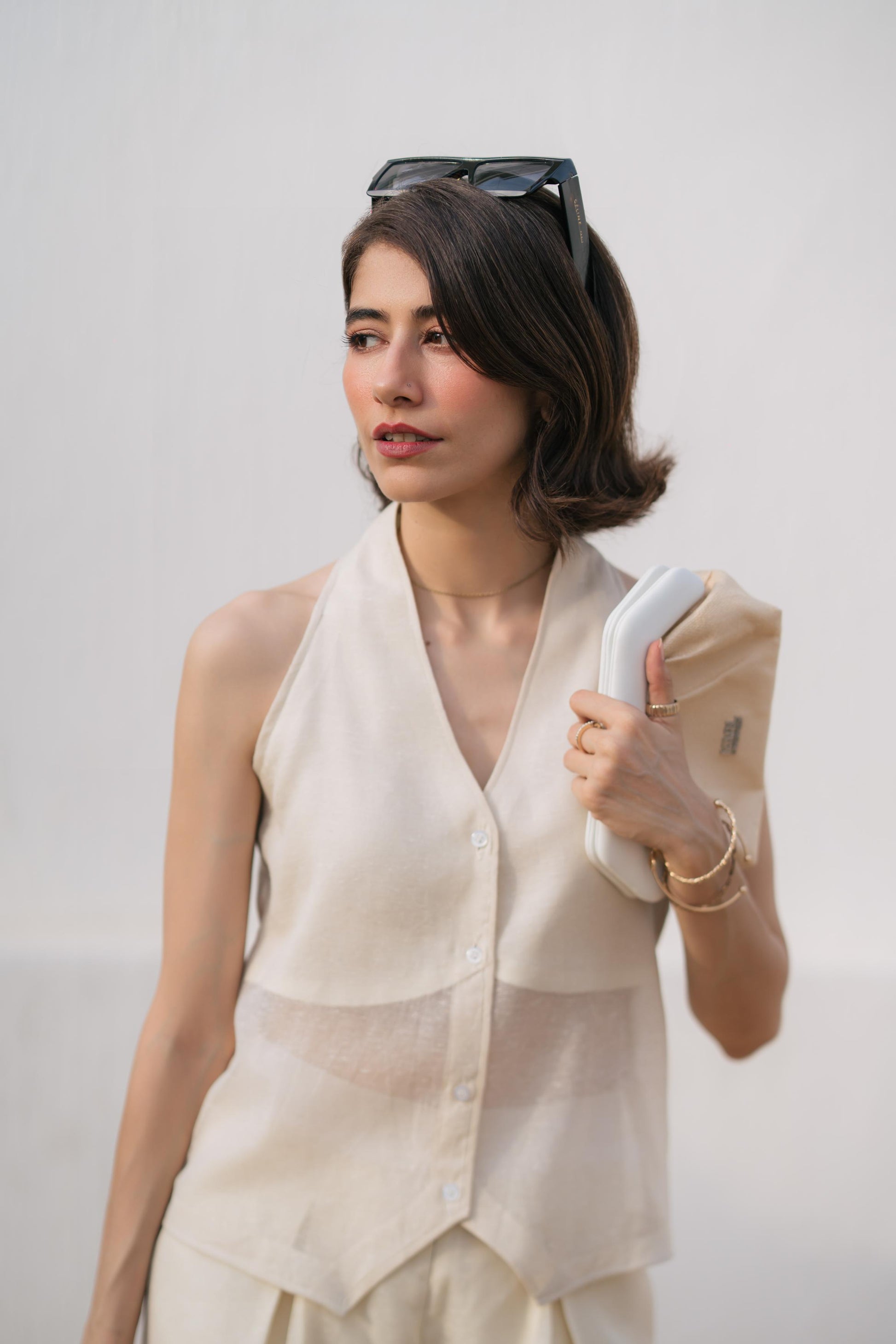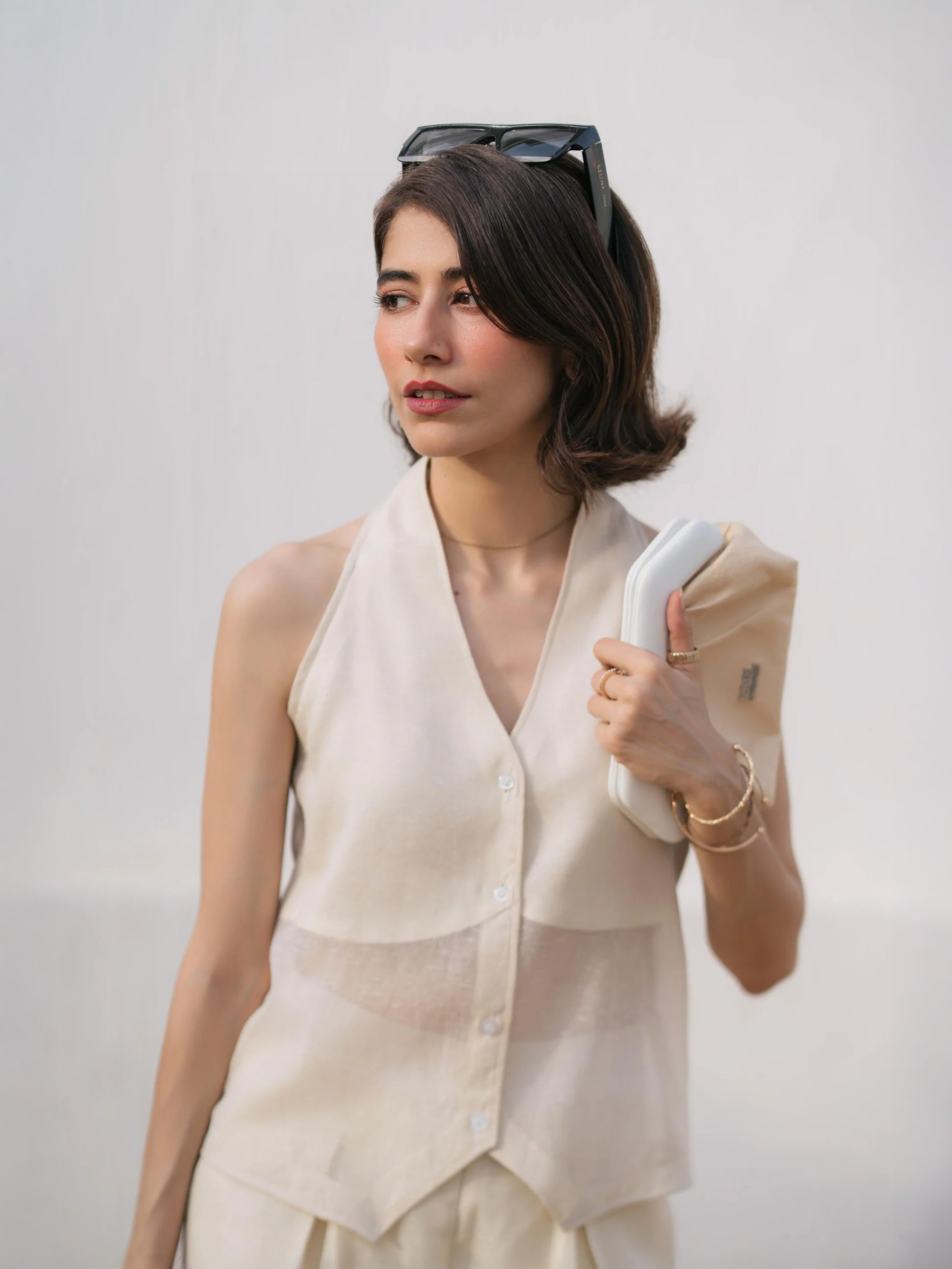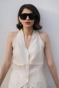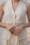 A halter-style waistcoat with a clean front button-down and softly structured silhouette. Crafted in corduroy khaddi, it blends tailoring with breathability — for when you want structure without trying too hard. Comes in a creamy off-white tone that wears like a whisper.