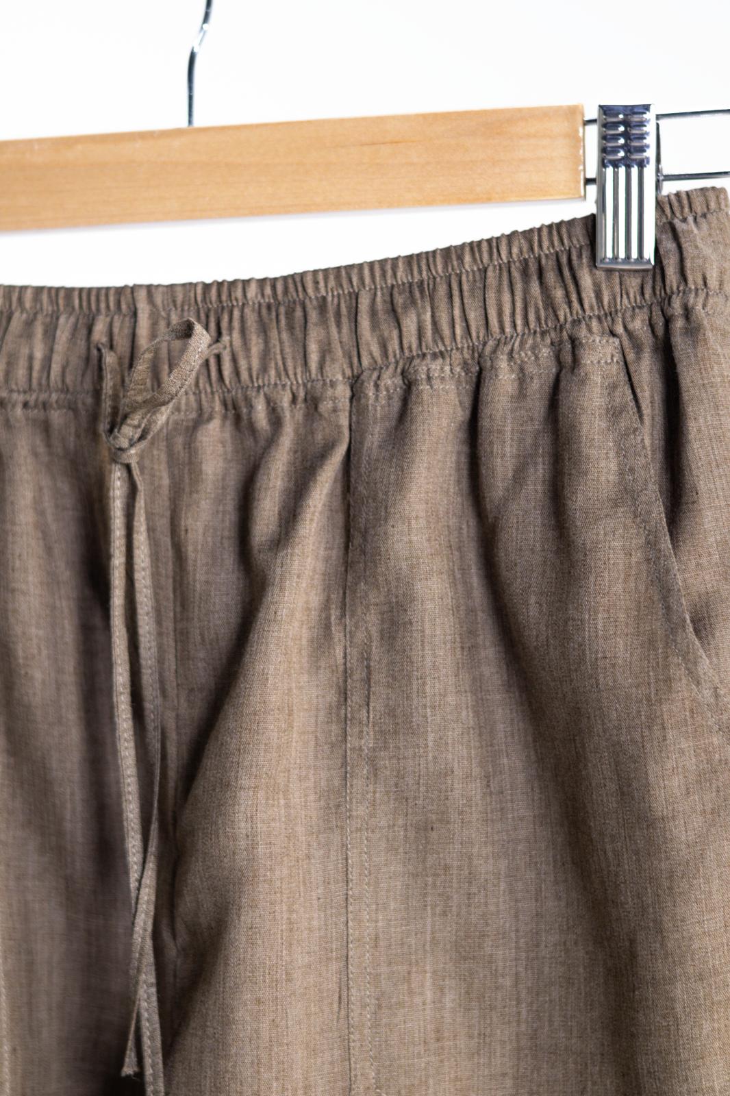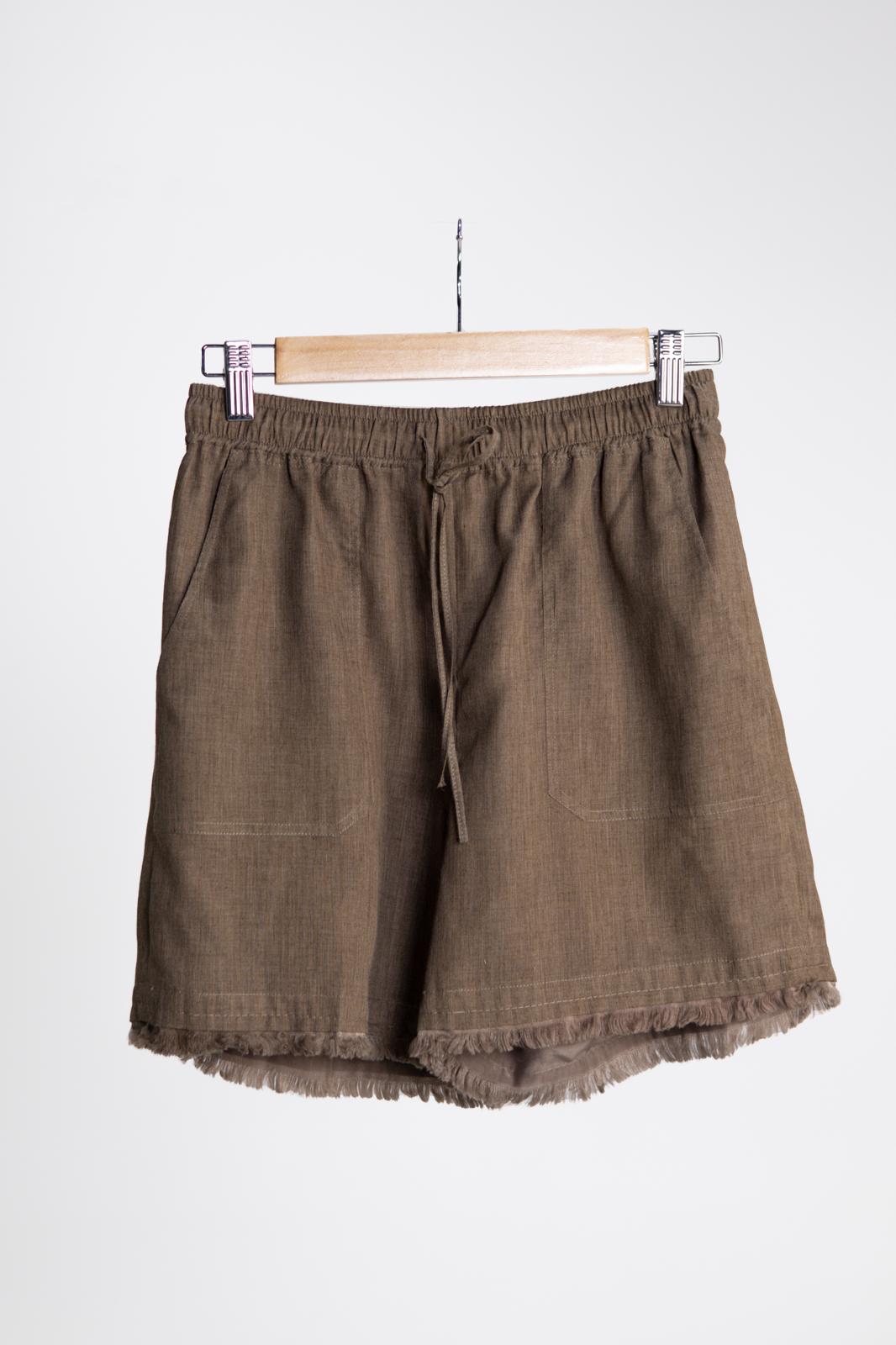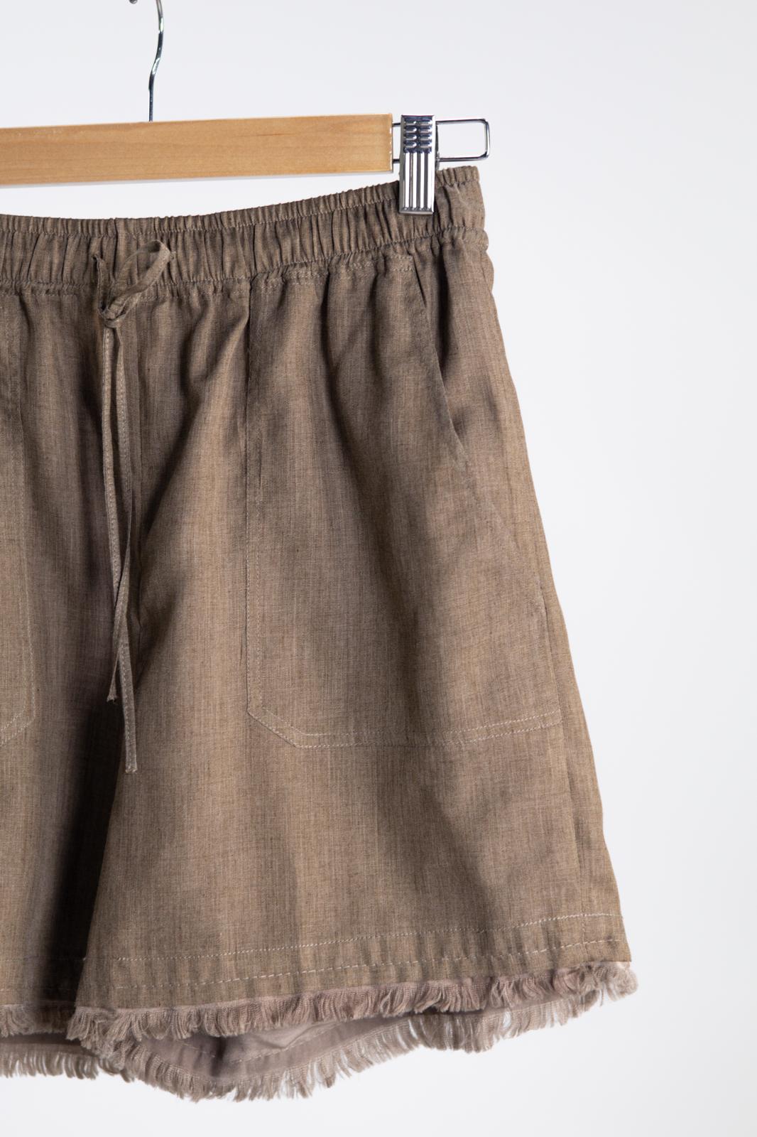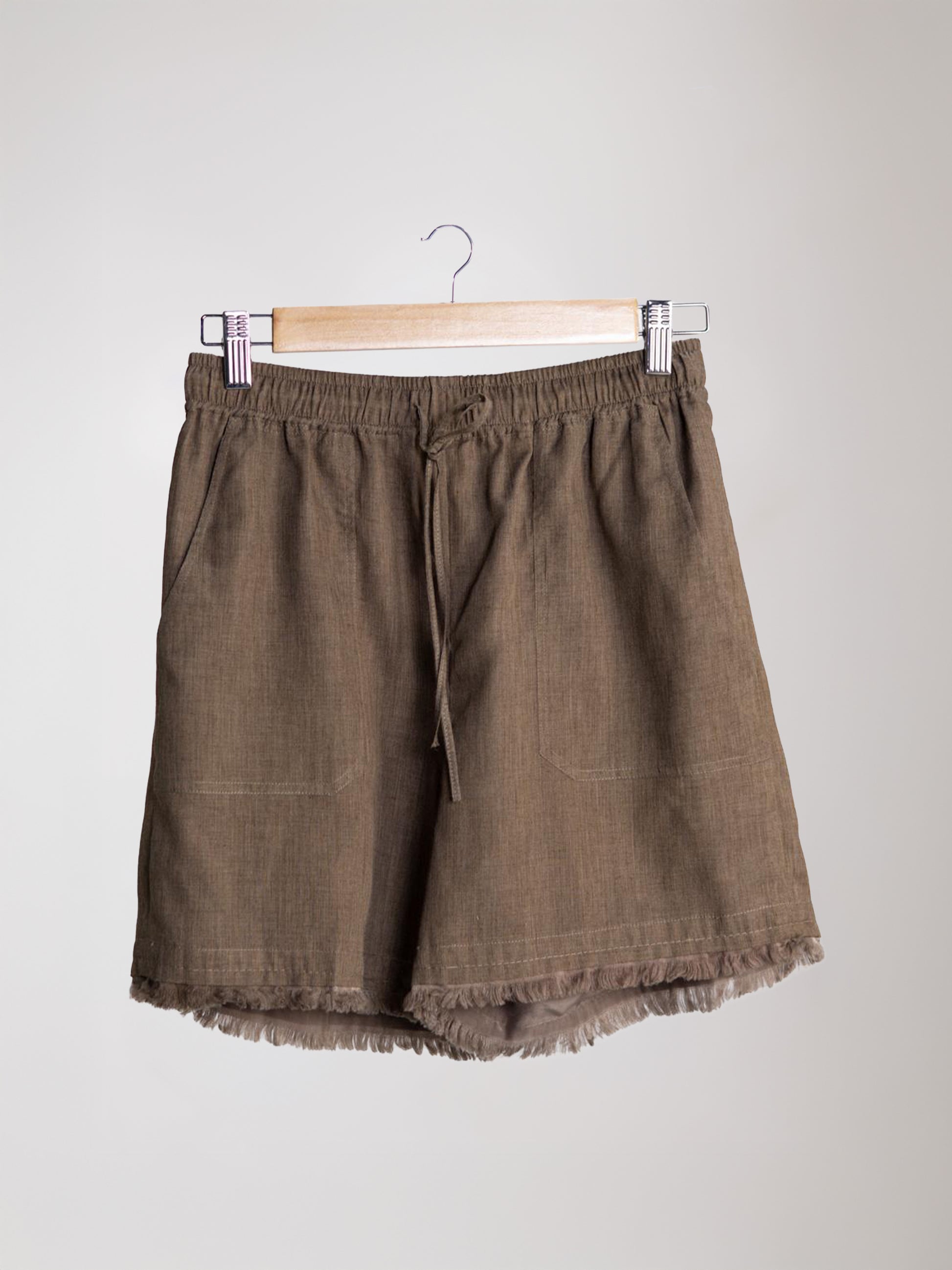 Relaxed drawstring shorts in the same earthy tone, detailed with frayed hems that add character to its otherwise minimal cut. A piece that feels lived-in from the first wear — comfortable, carefree, and quietly chic.