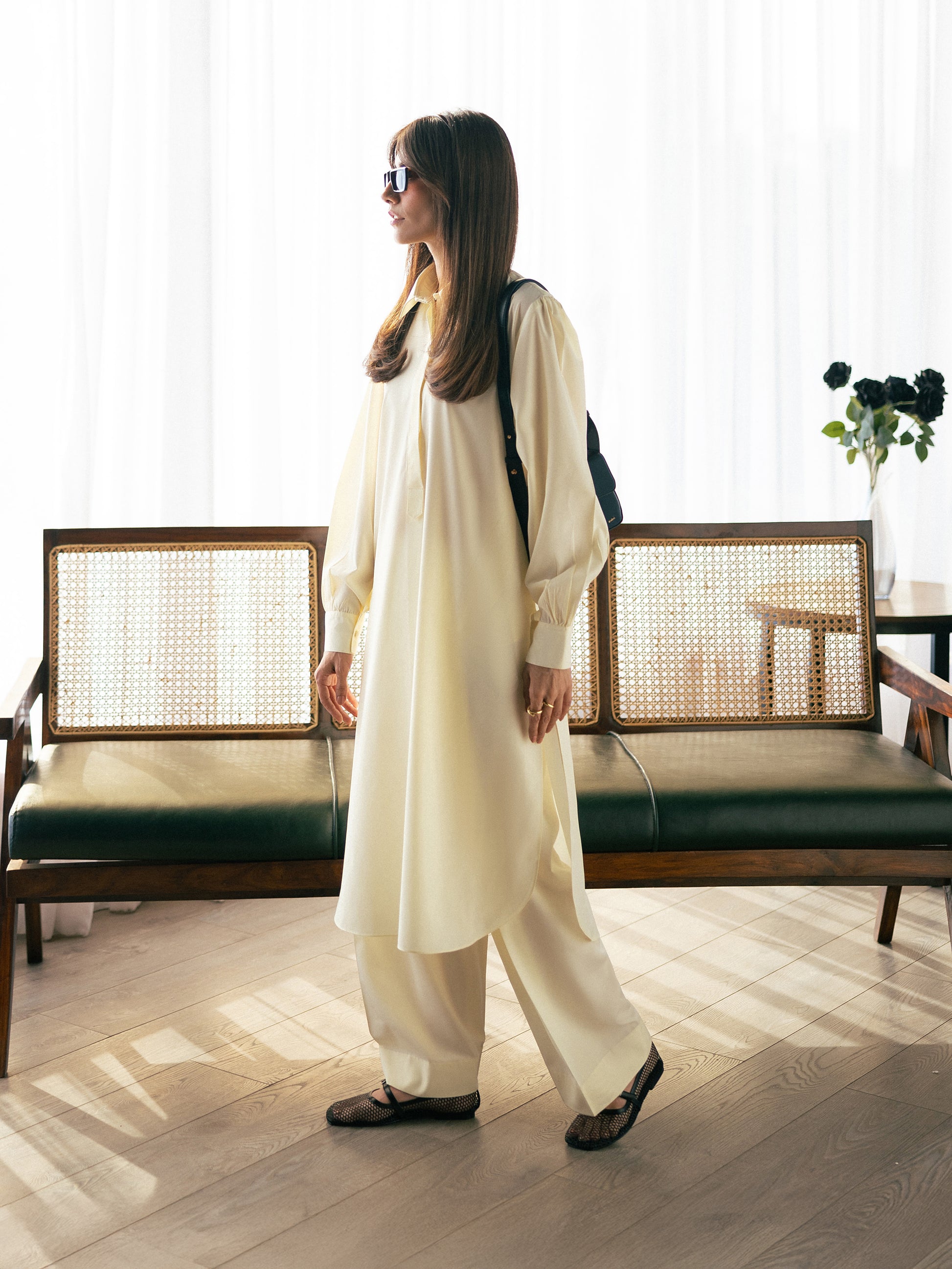 Refined yet effortless, Ivory Reverie is a tribute to understated elegance. Crafted from luxurious bhoski, the fabric drapes with an organic fluidity, offering a perfect blend of structure and movement. The tailored kameez features a classic collared neckline and voluminous sleeves, cinched at the cuffs for a polished touch. Paired with a relaxed shalwar, this ensemble embodies quiet sophistication—balancing tradition with contemporary ease. Ivory Reverie is a statement in minimalism, exuding grace in every step, designed for seamless transitions from day to evening.