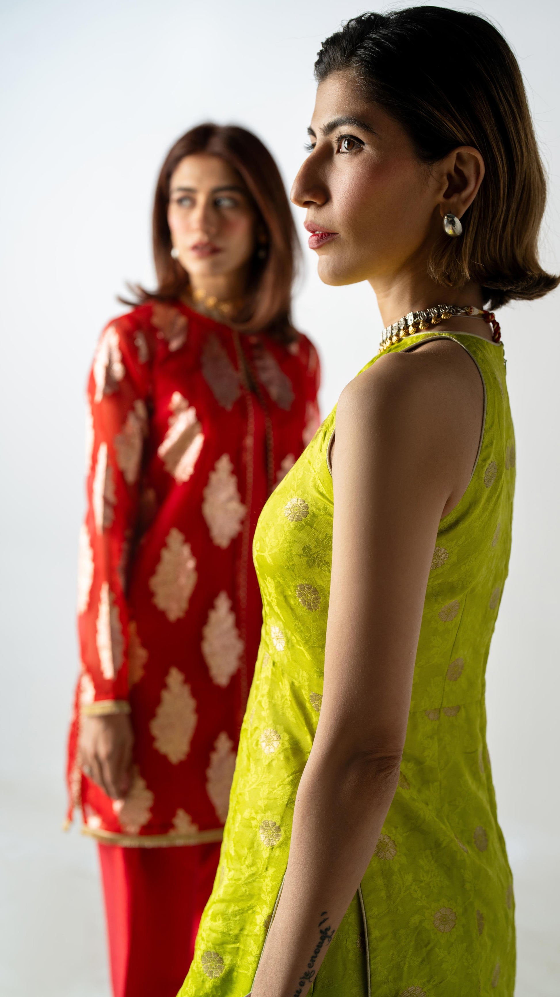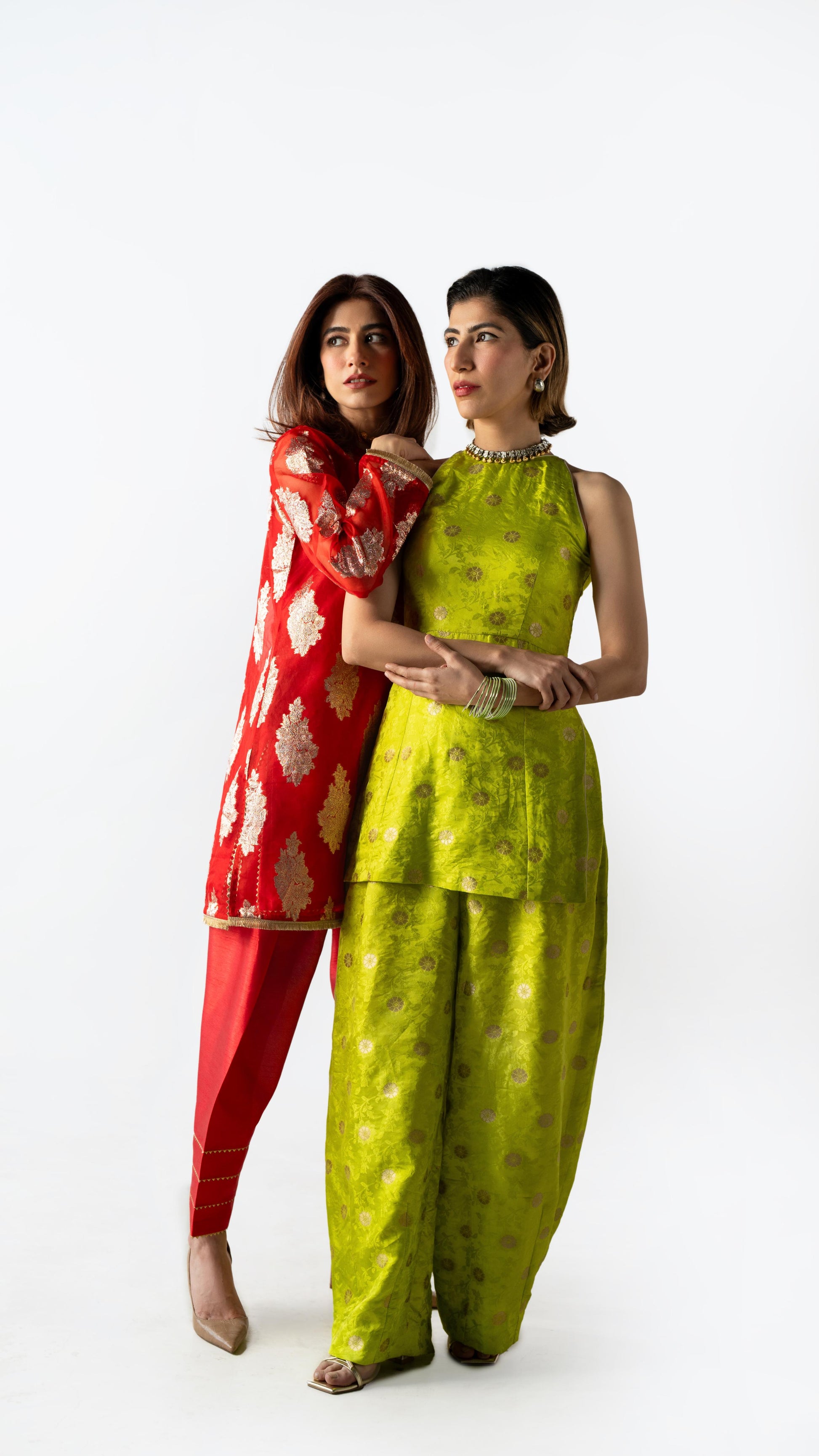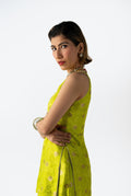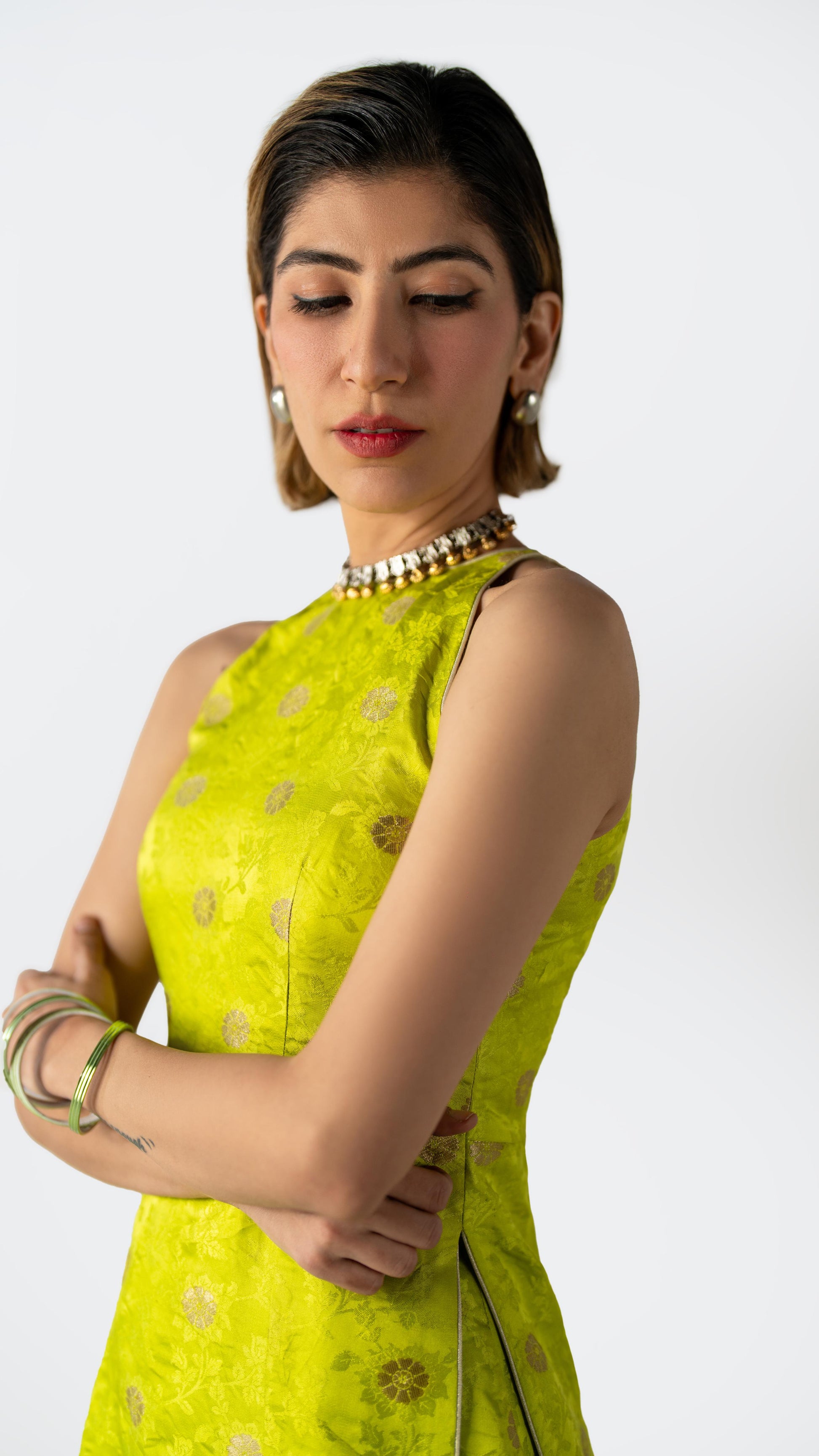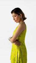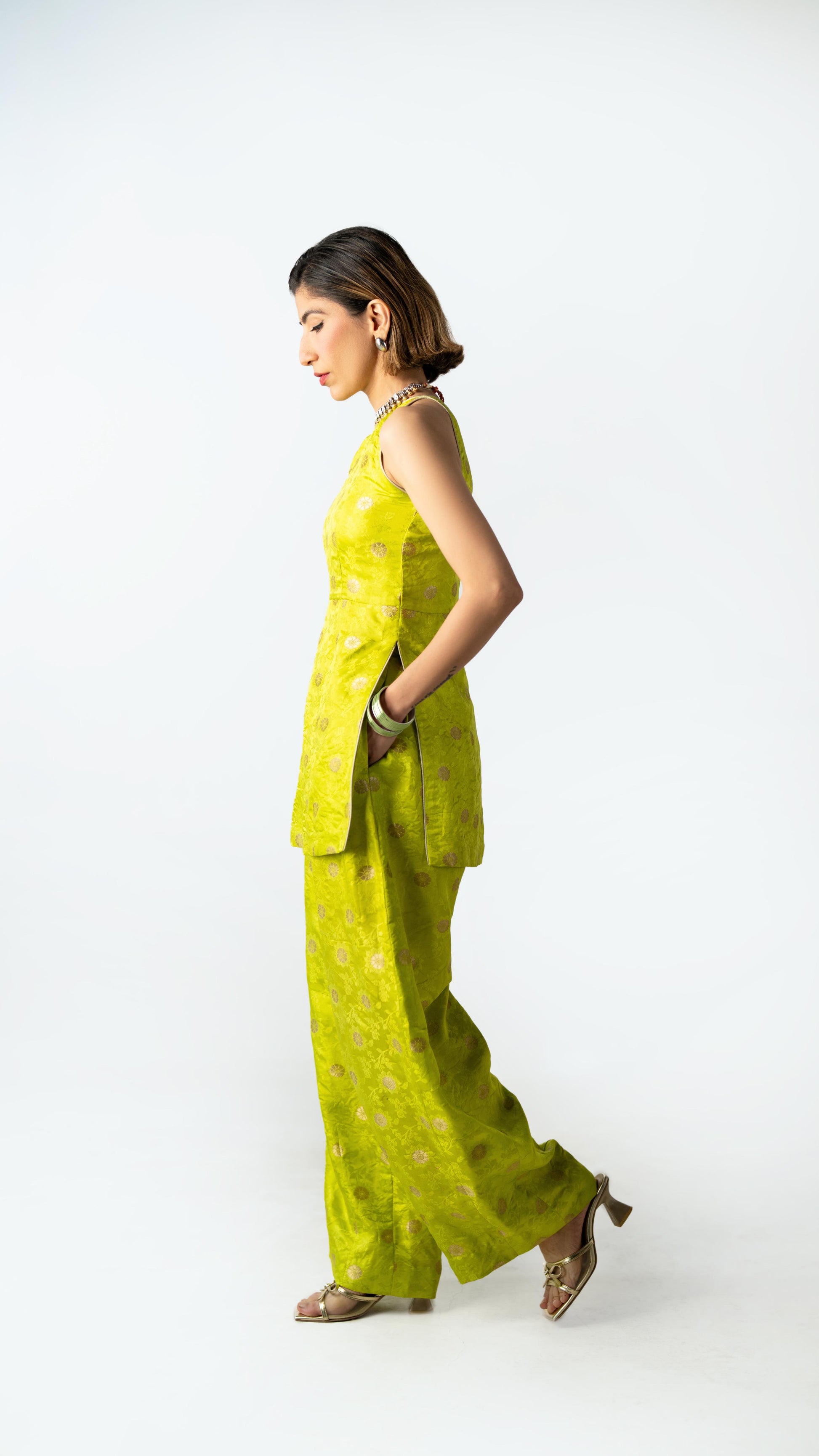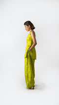 A two-piece ensemble in Benares silk brocade, rendered in Electric Pistachio with green zest undertones. The structured longline top with side openings is paired with sculpted volume pants — bold, festive, and precisely cut.