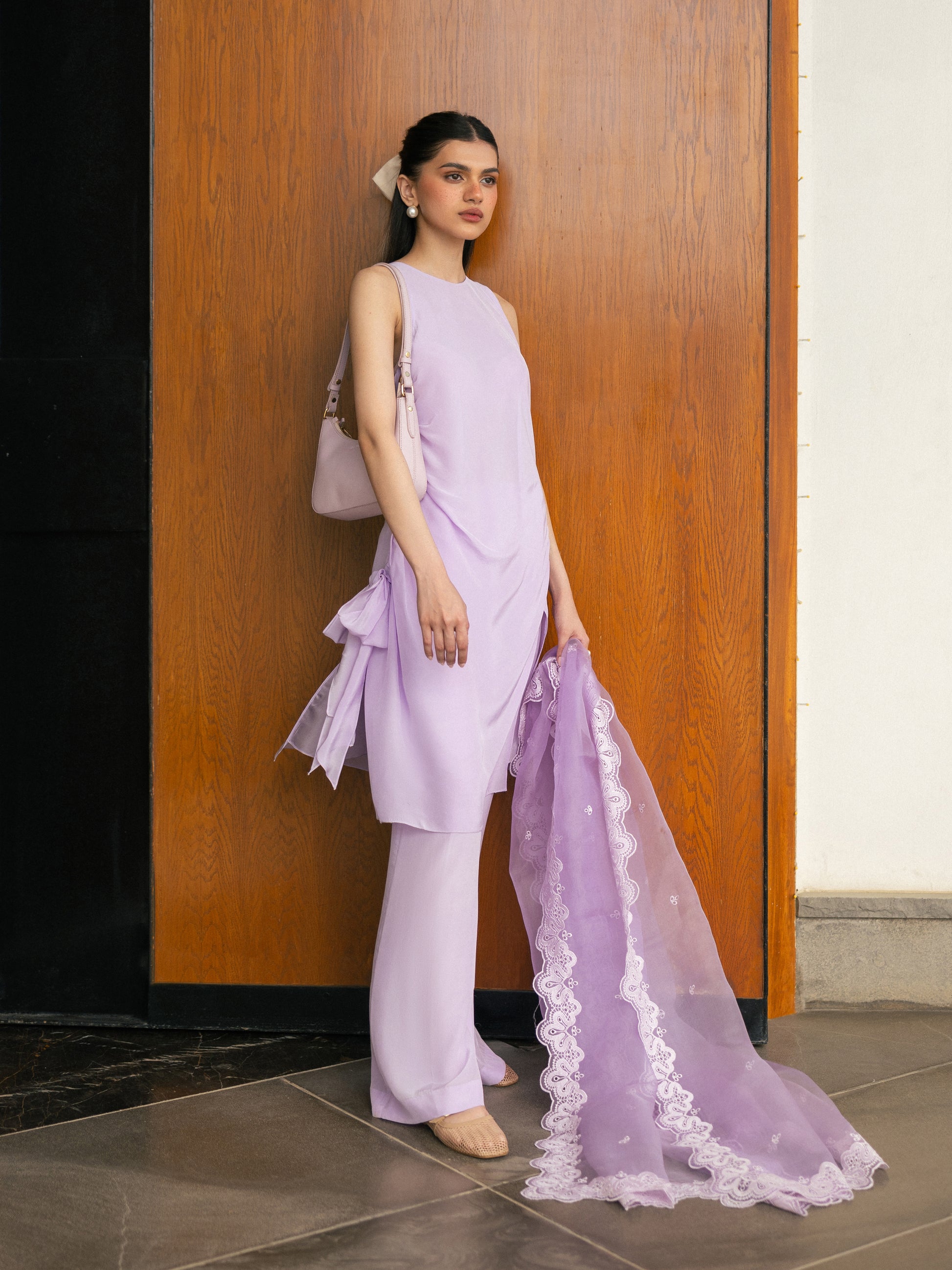 Mauve Melody is a seamless blend of modern refinement and delicate femininity. Crafted from fluid crepe silk, the ensemble drapes effortlessly, enhancing its graceful silhouette. A structured yet softly flowing tunic features delicate gathered detailing, adding a touch of movement and charm. The matching wide-leg trousers create an elongated, statuesque form, exuding effortless sophistication. Completing the look, the pure organza dupatta—adorned with intricate lacework—introduces an ethereal, romantic dimension. Designed for those who appreciate understated luxury, Mauve Melody is perfect for daytime elegance and moonlit soirées.