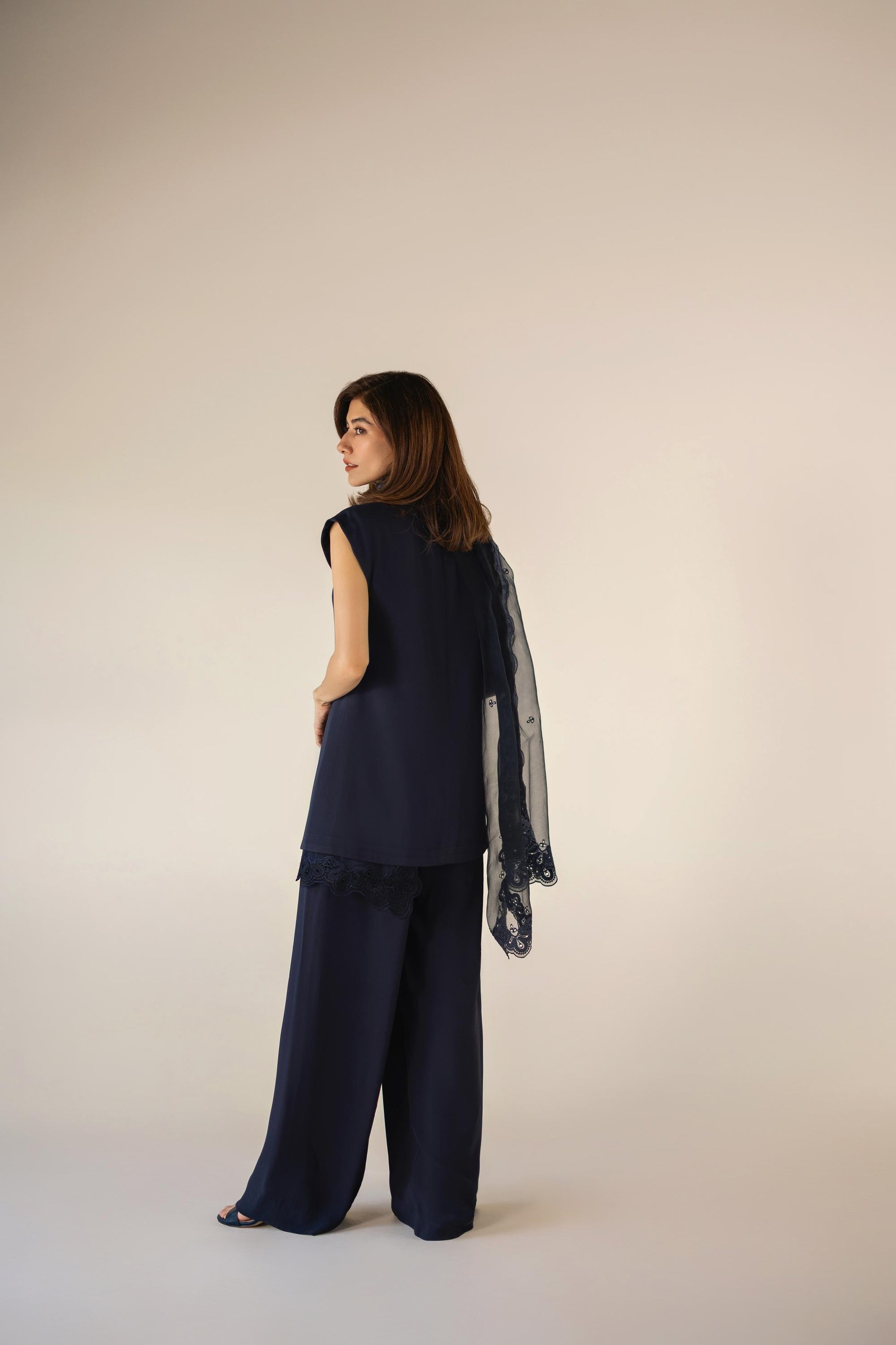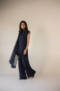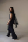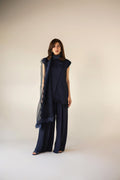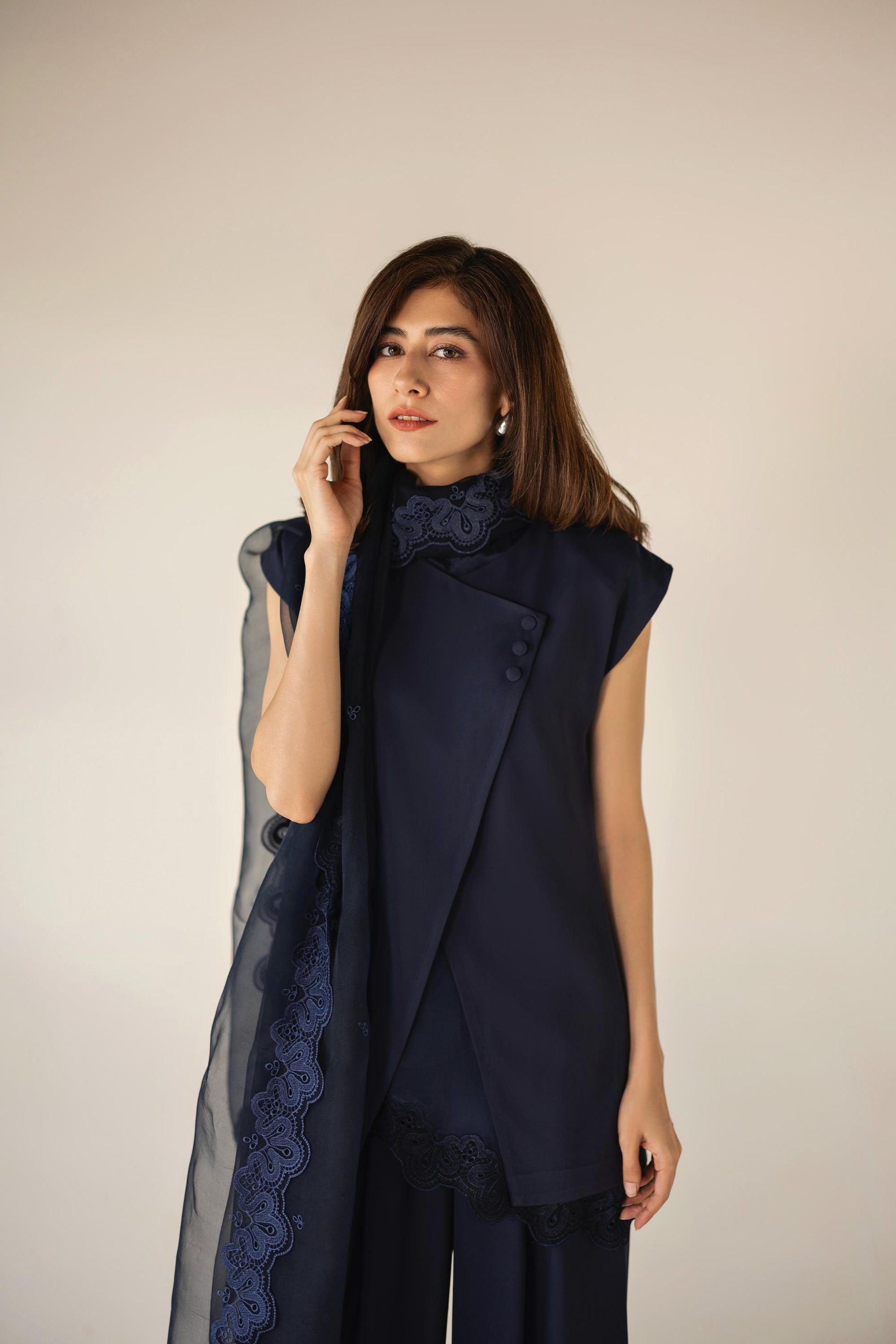 Structured and fluid in equal measure, Midnight Fold is crafted in heavy georgette. layered over deep Russian silk and paired with a sheer organza dupatta edged in tonal embroidery. The angled overlap, clean lines, and sleeveless silhouette evoke quiet strength, while the midnight hue grounds it all in cool, composed clarity.