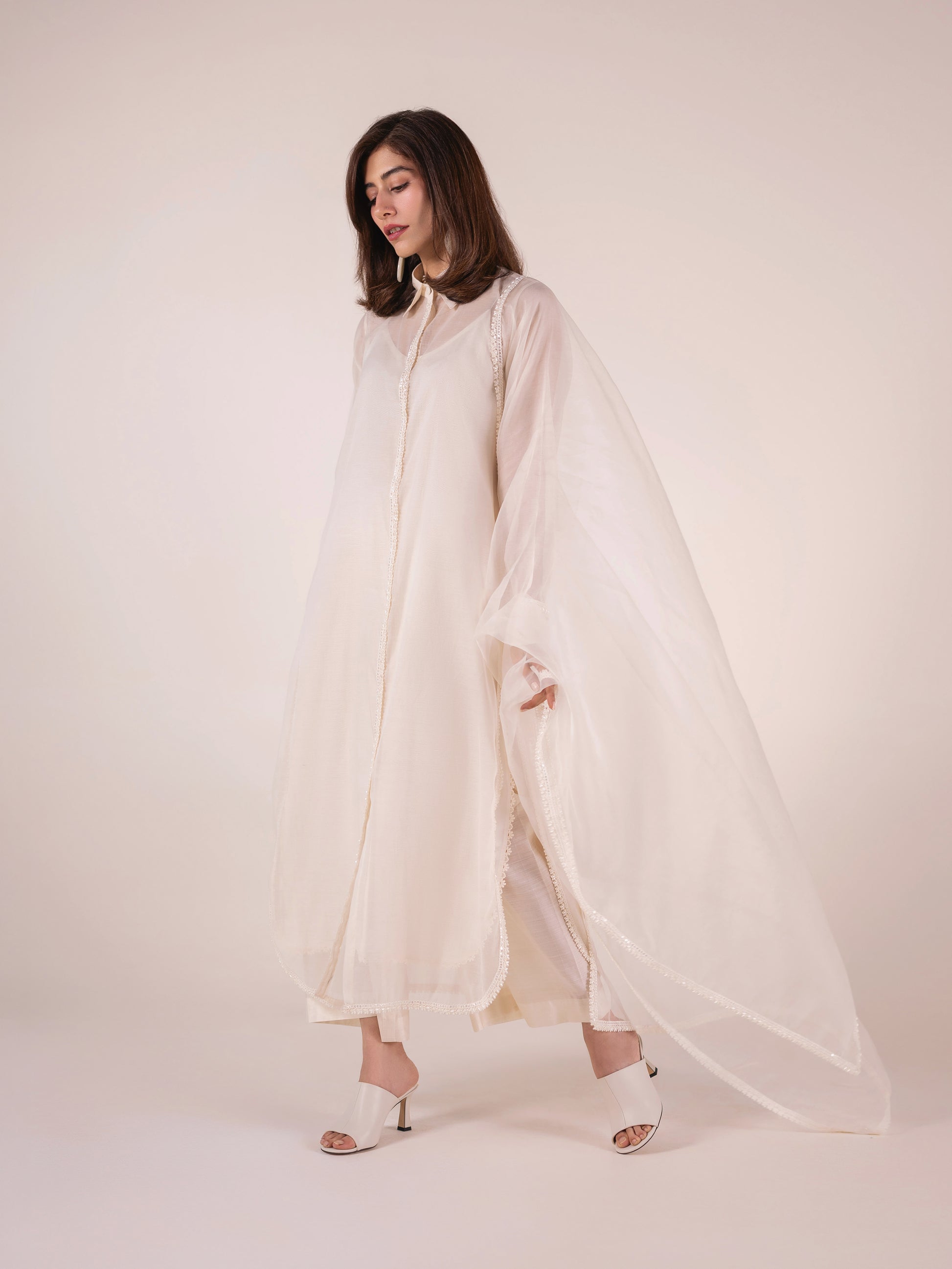 A moment held in softness. Pale Hour features a sheer kameez in weightless Kora cotton, delicately traced with tonal detailing and grounded in the fluidity of Russian silk lining. Paired with tailored Khaddi silk pants, this silhouette speaks in a whisper — composed, unhurried, and resolutely elegant.