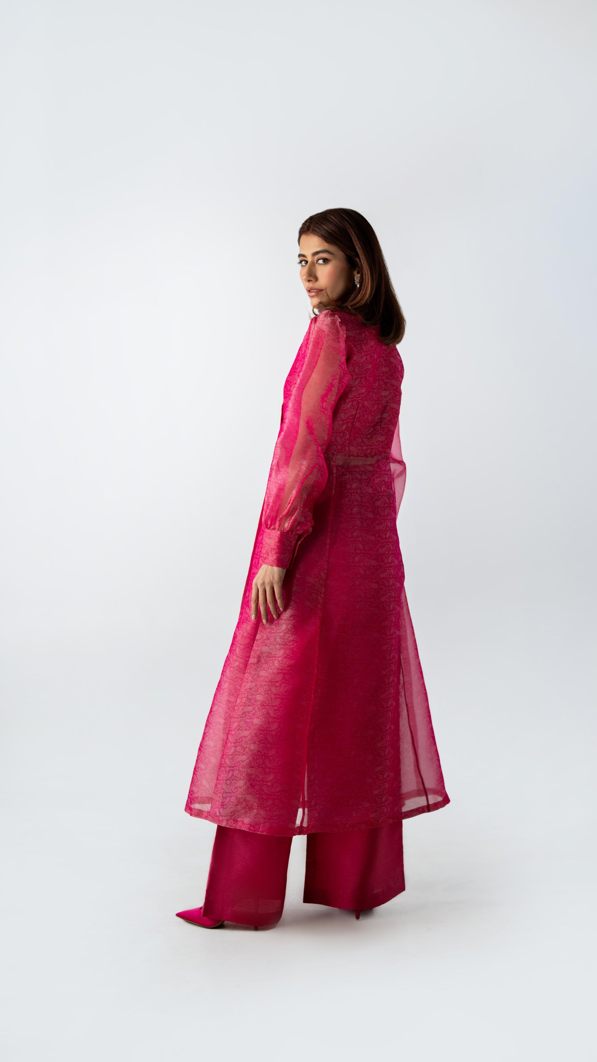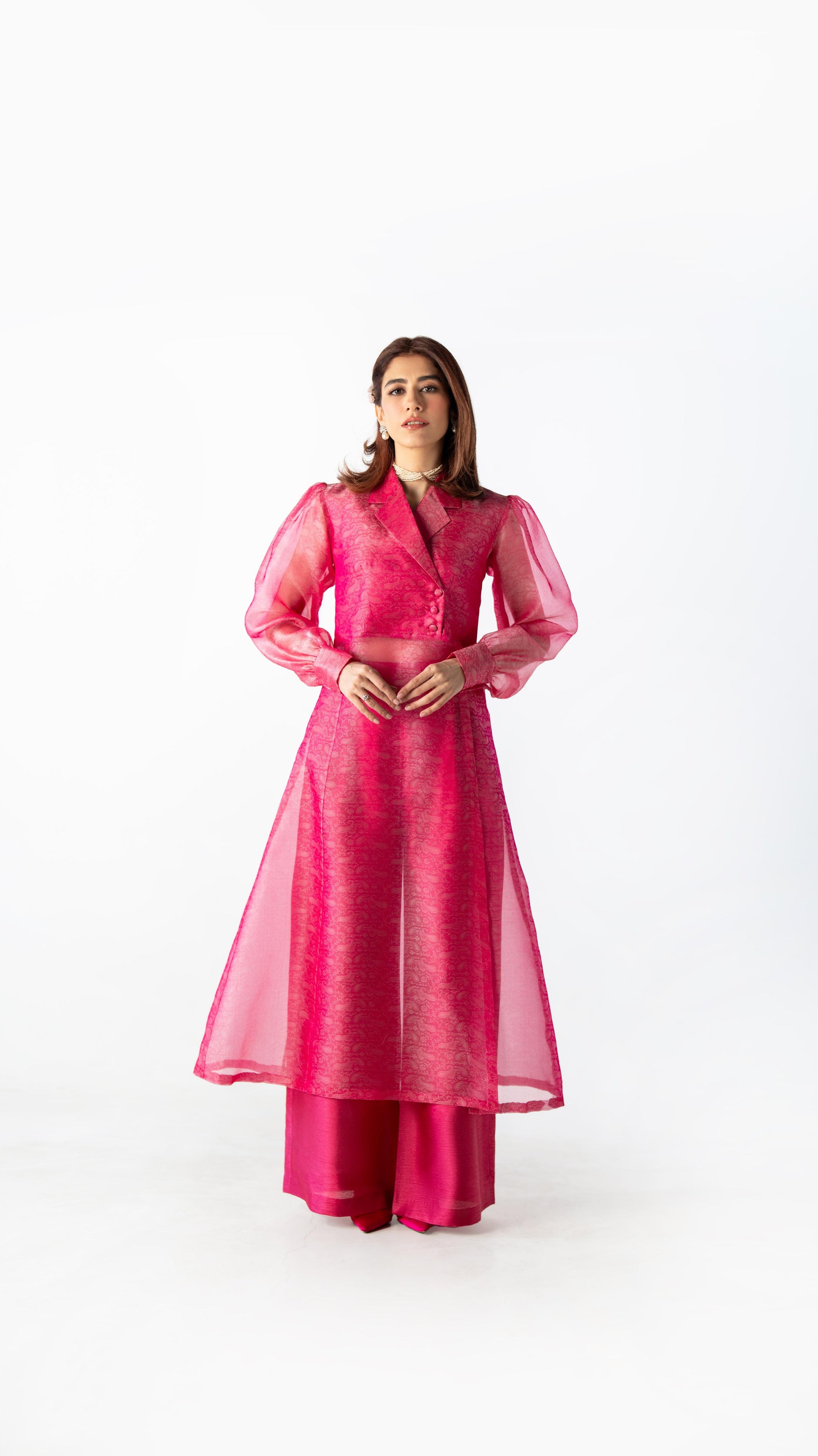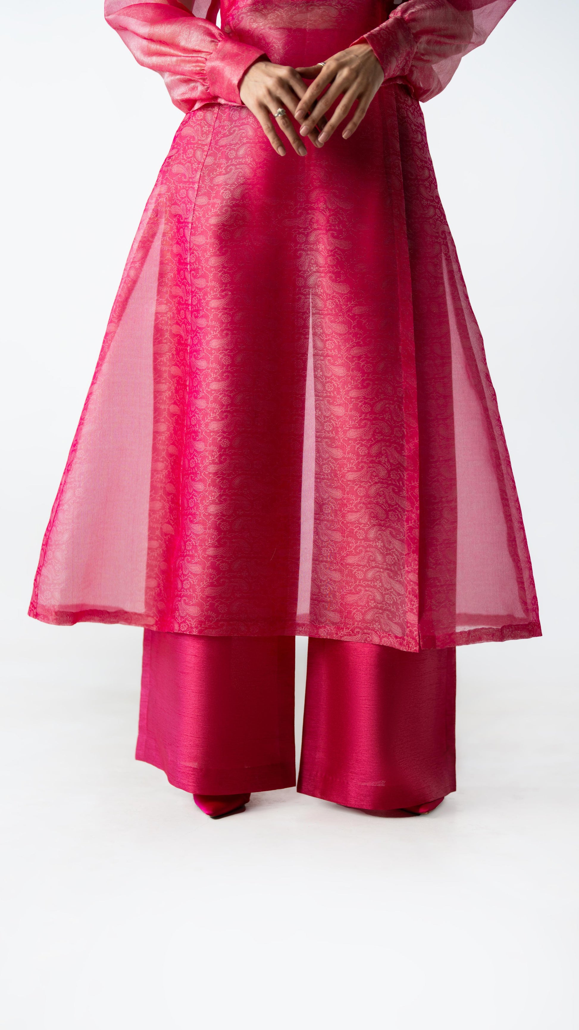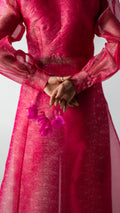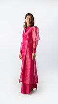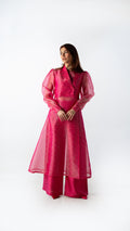 Crafted in tonal silk organza, Pink Clarity is rendered in a striking candy fuchsia hue. The sheer qameez features a clean front slit, layered over fluid wide-leg trousers. Light in feel, confident in presence.