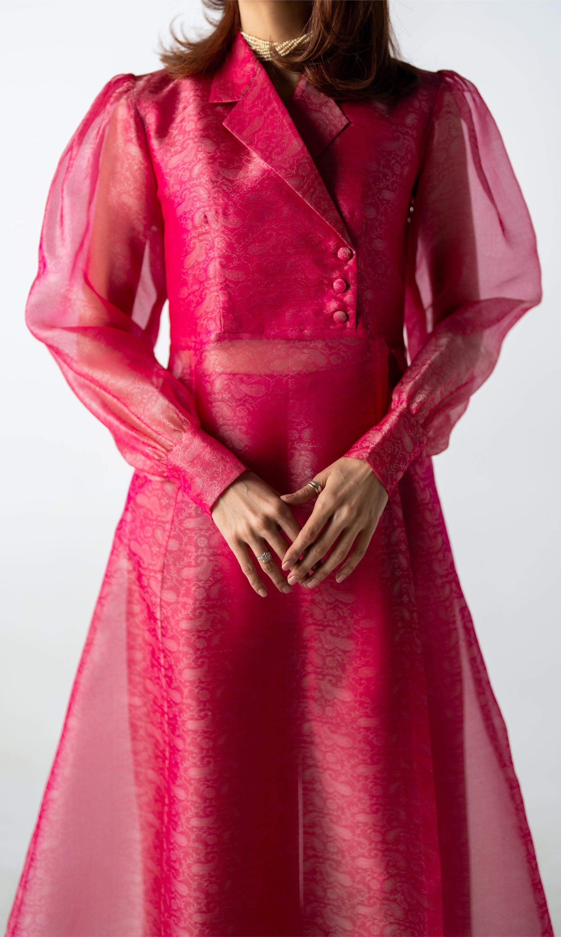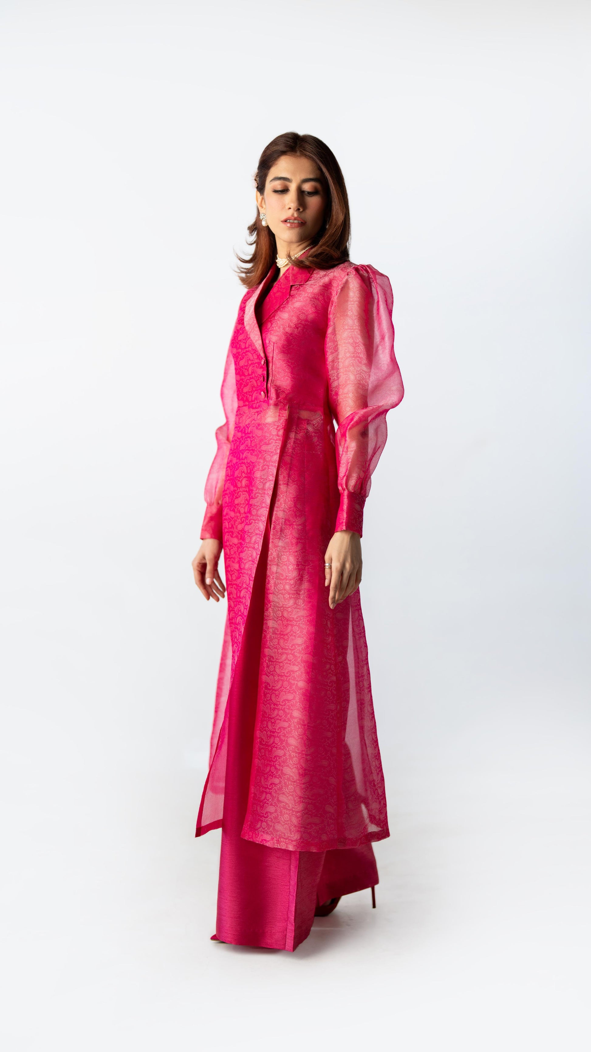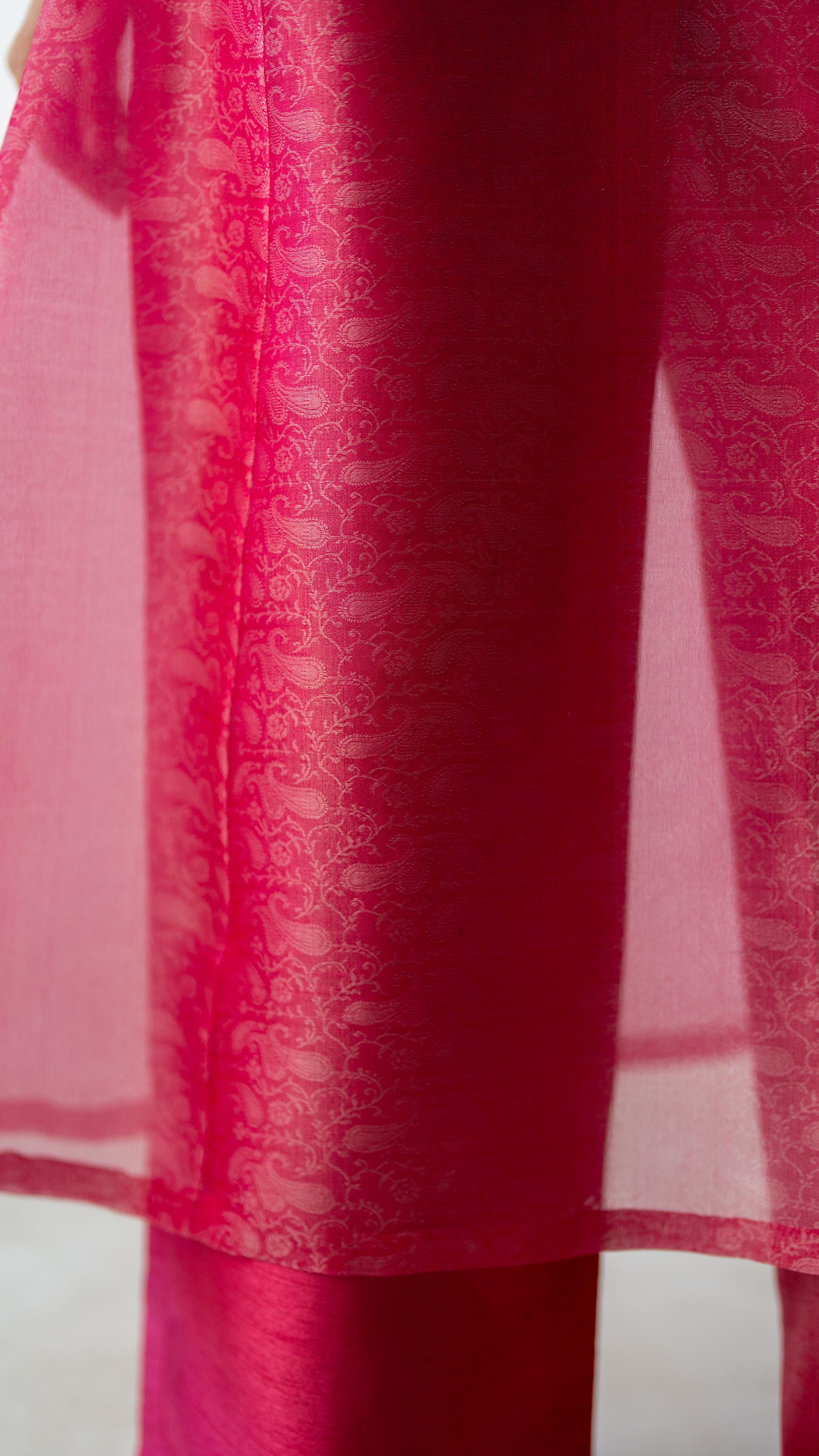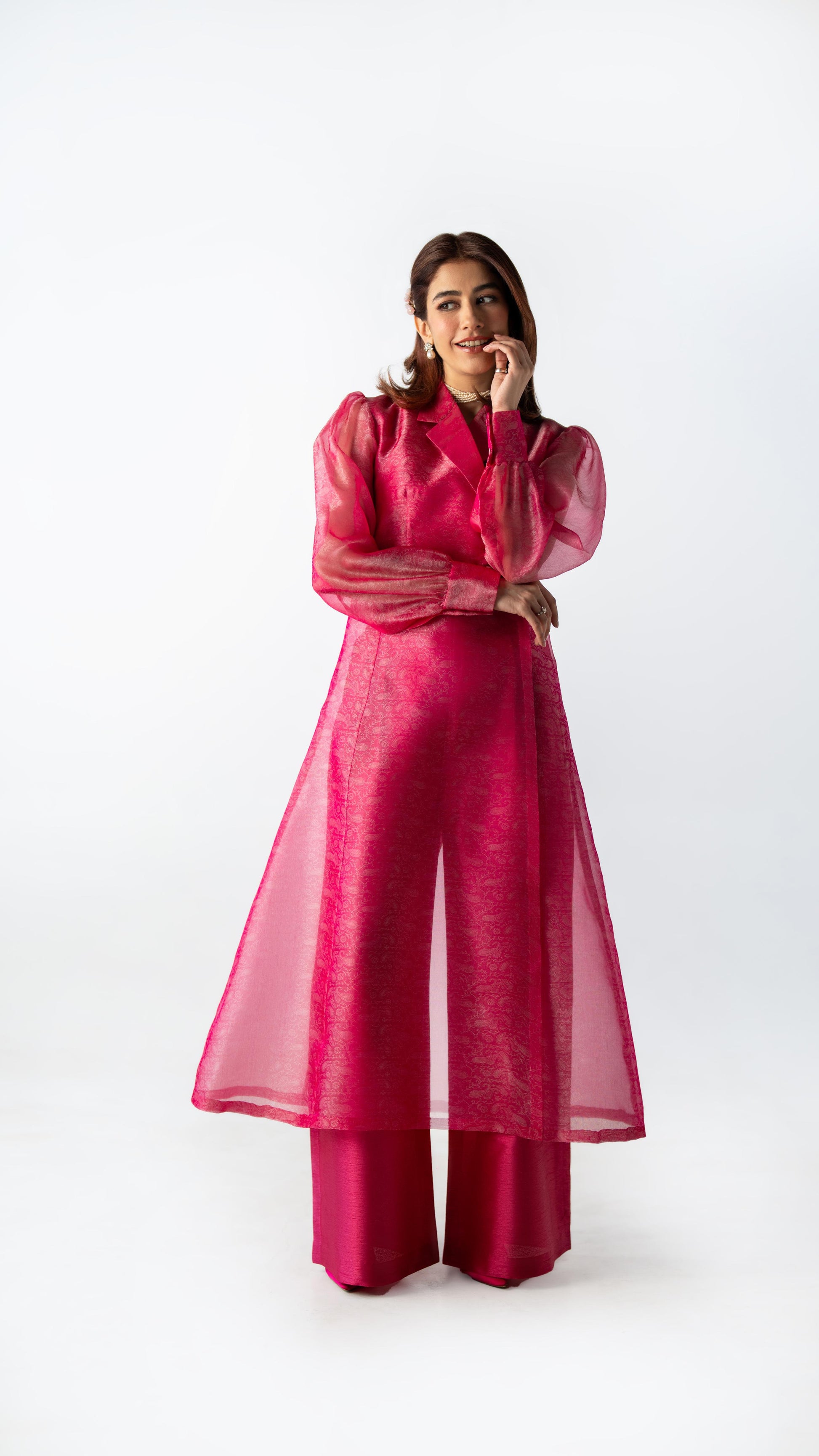 Crafted in tonal silk organza, Pink Clarity is rendered in a striking candy fuchsia hue. The sheer qameez features a clean front slit, layered over fluid wide-leg trousers. Light in feel, confident in presence.