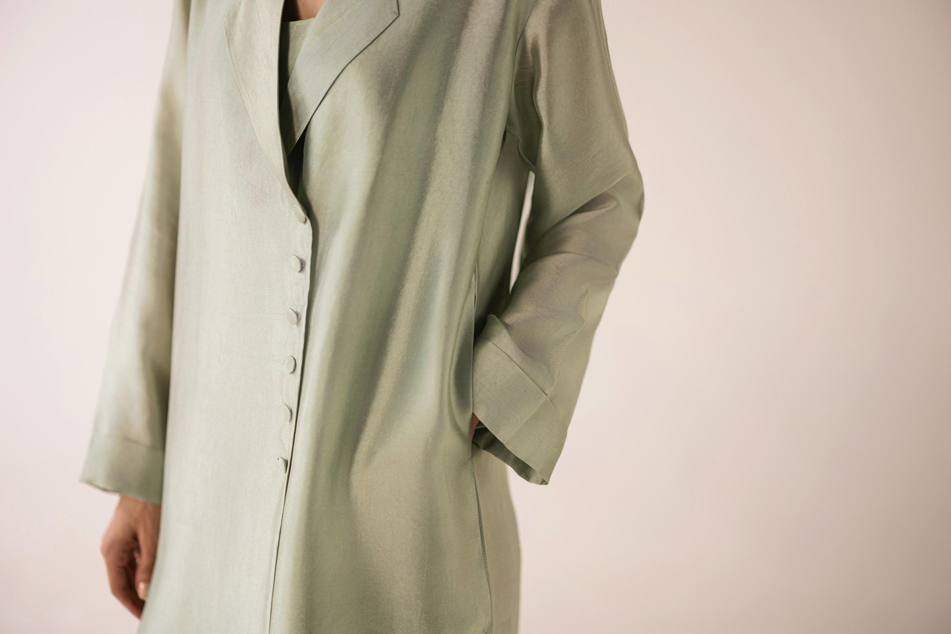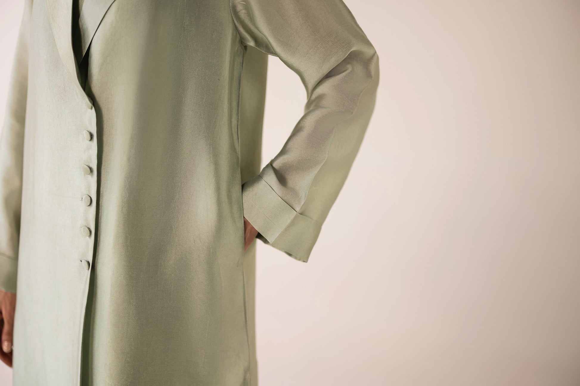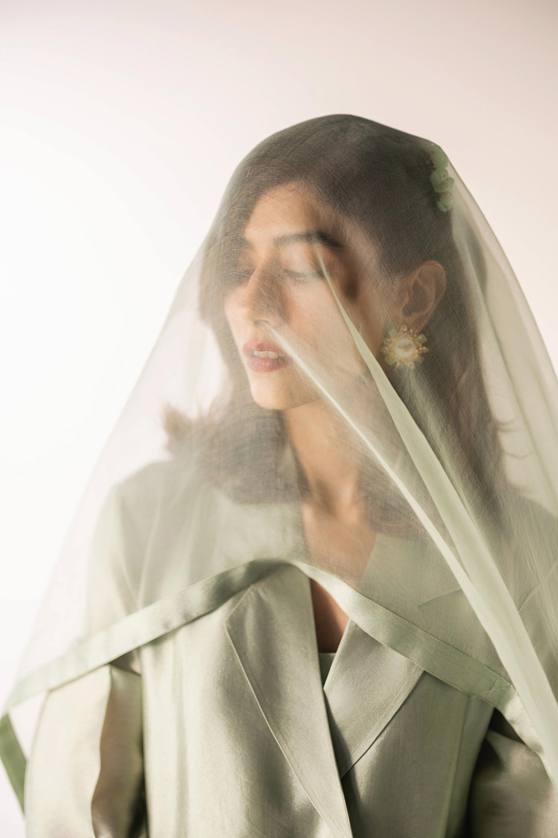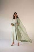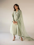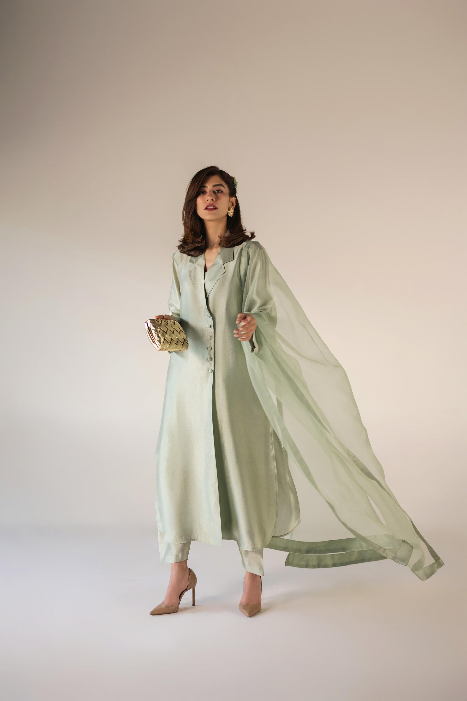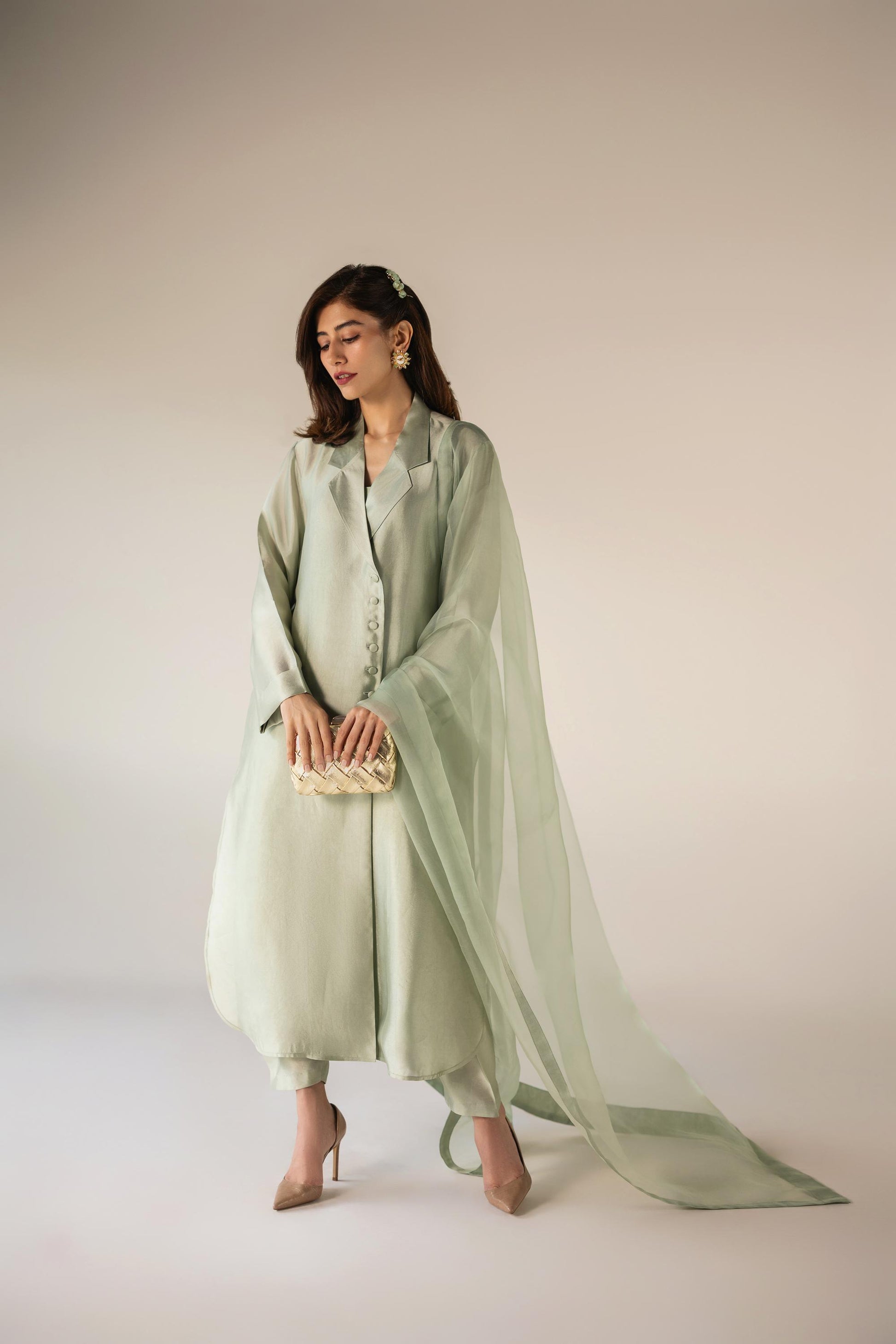 A composition in stillness. Sage Verse is crafted from luminous sheesha silk — the kameez and pant flowing in tonal rhythm, grounded by the soft sheen of silk and the quiet architecture of clean lines. Finished with a sheer organza dupatta that moves like breath, this ensemble is a gentle assertion — poised, fluid, and deeply felt.