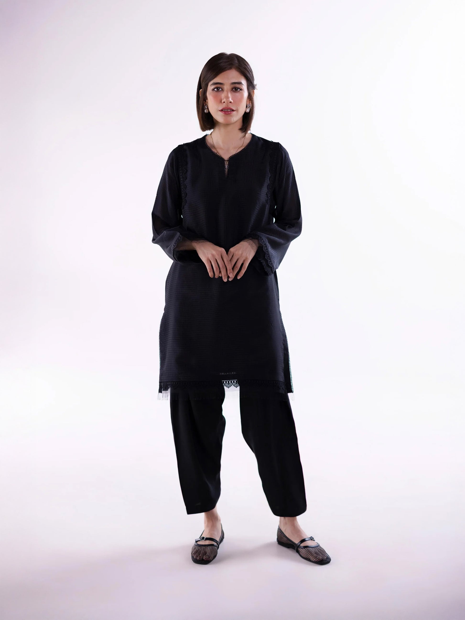 A quiet classic reimagined with depth and texture, Shadow Script is crafted from self-printed checkered silk, lined with soft medium silk and paired with a khaddi silk kharri shalwar. Lace accents and pure organza trimming at the sleeves and hem add refined detail, allowing the ensemble to move with intention and ease. It's a piece that doesn't raise its voice—one that lingers, like an afterthought that stays.