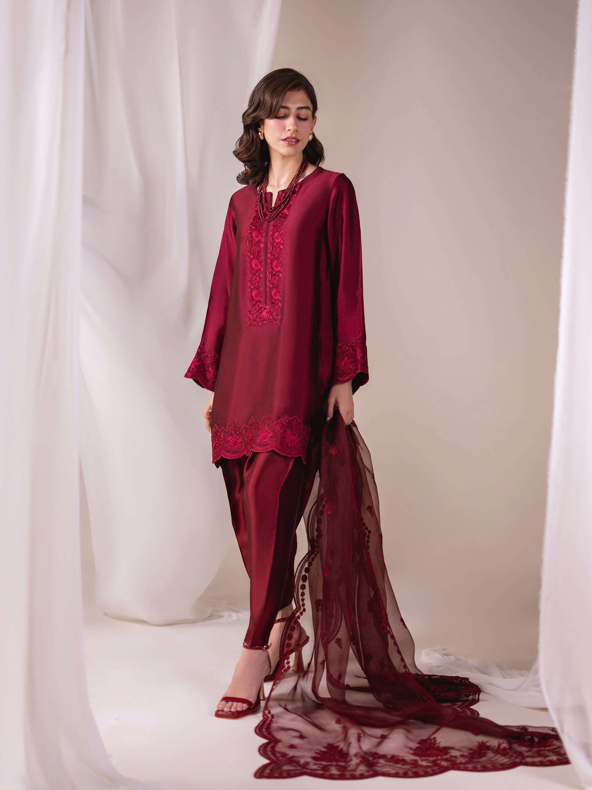 The First Flame is a promise in silk, bold yet reverent. Crafted in pure sheesha silk, this ensemble pairs a short, embroidered qameez with a tailored khari shalwar, striking a balance between tradition and intent. The sleeves, scalloped and hand finished, bring elegance to the edges. A sheer organza dupatta completes the silhoutte weightless, yet unforgettable. For moments that ask to arrive fully, and without.