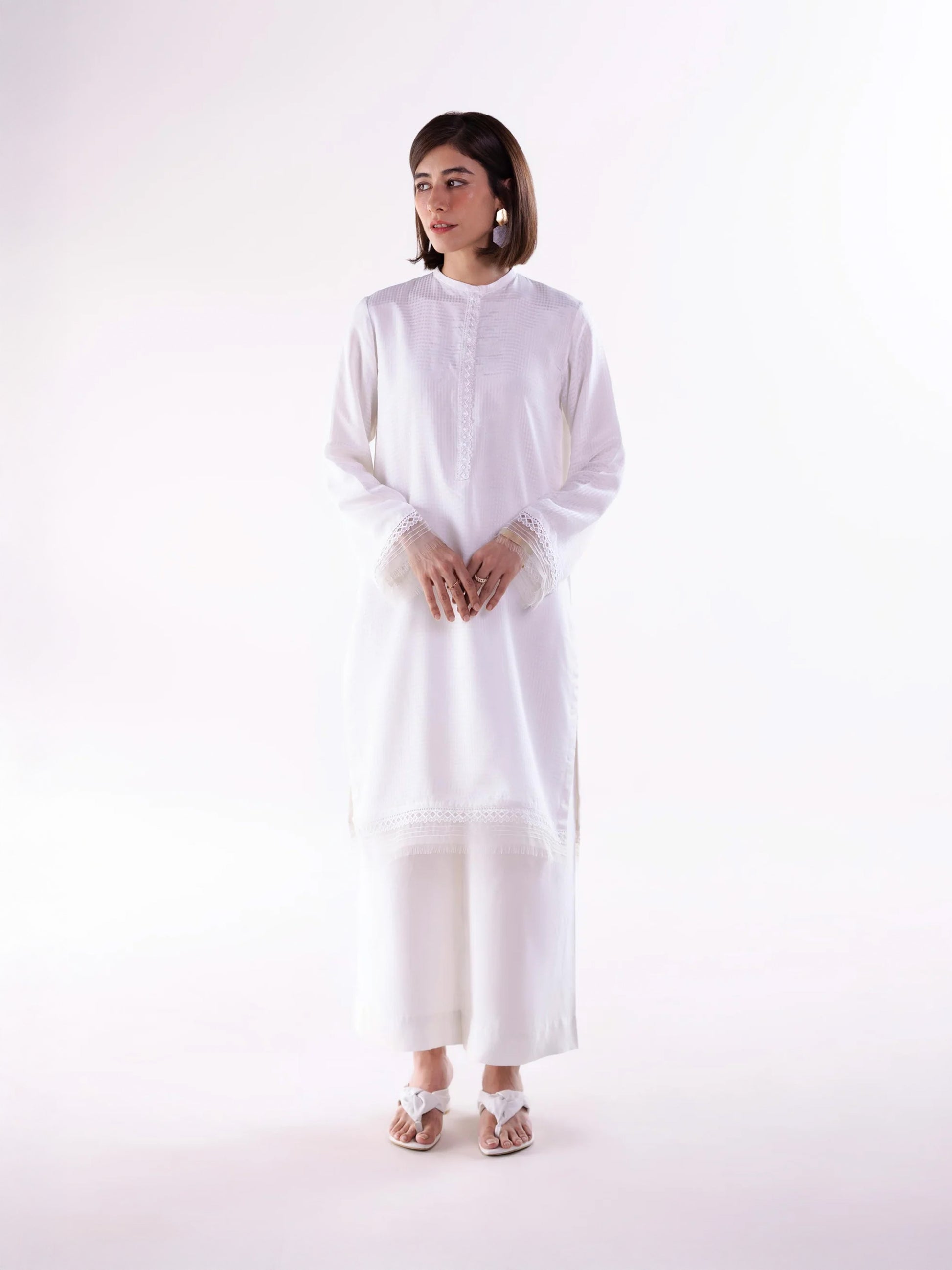 An exploration of silence through texture, White Noise is crafted from self-printed checkered silk and lined with soft medium silk for graceful movement. Subtle lace accents and pure organza trimming at the sleeves and hem add refined detail, while a khaddi silk kharri shalwar completes the ensemble. It's a quiet statement in restraint—designed for moments when less says everything.