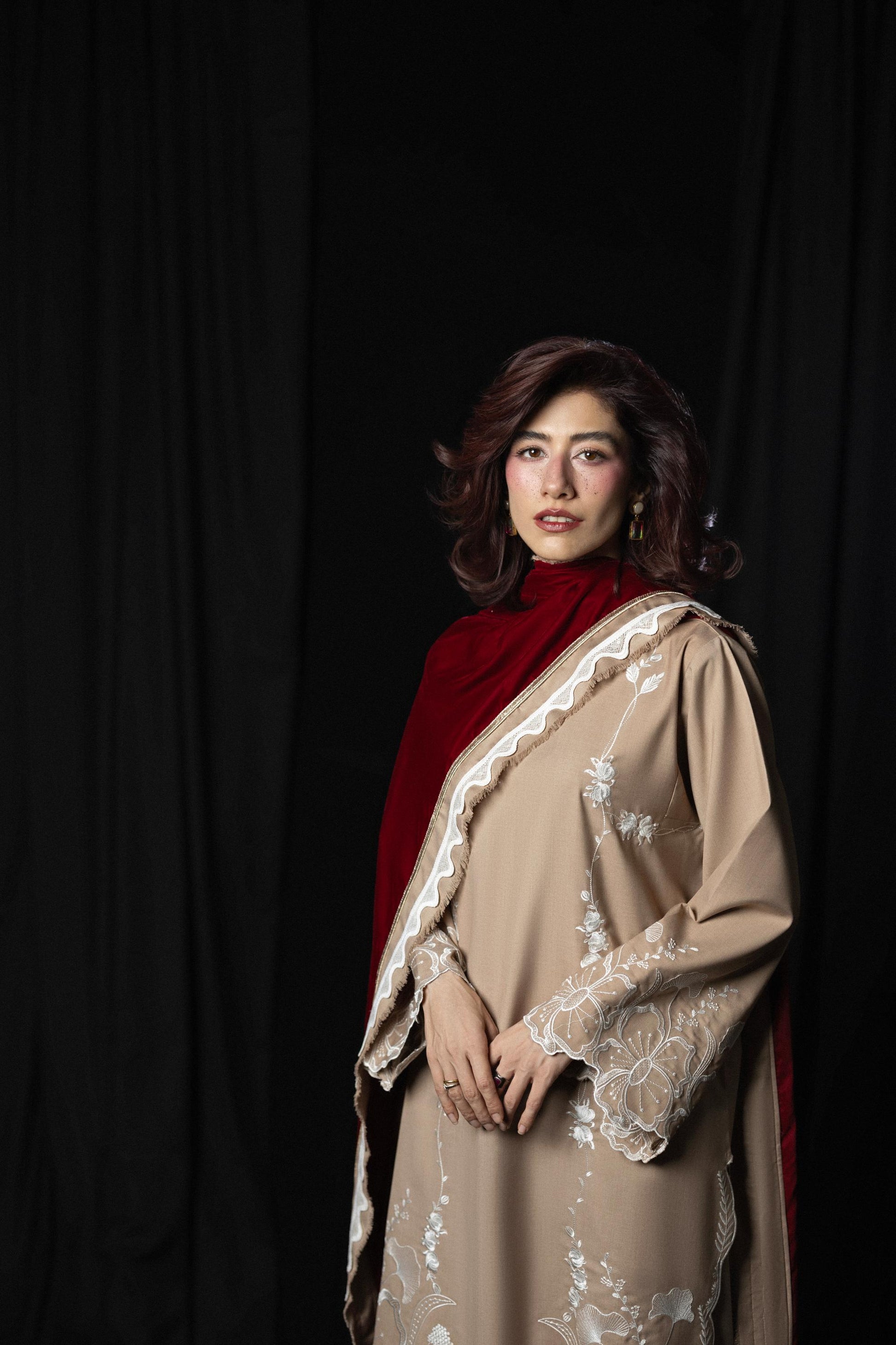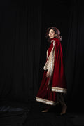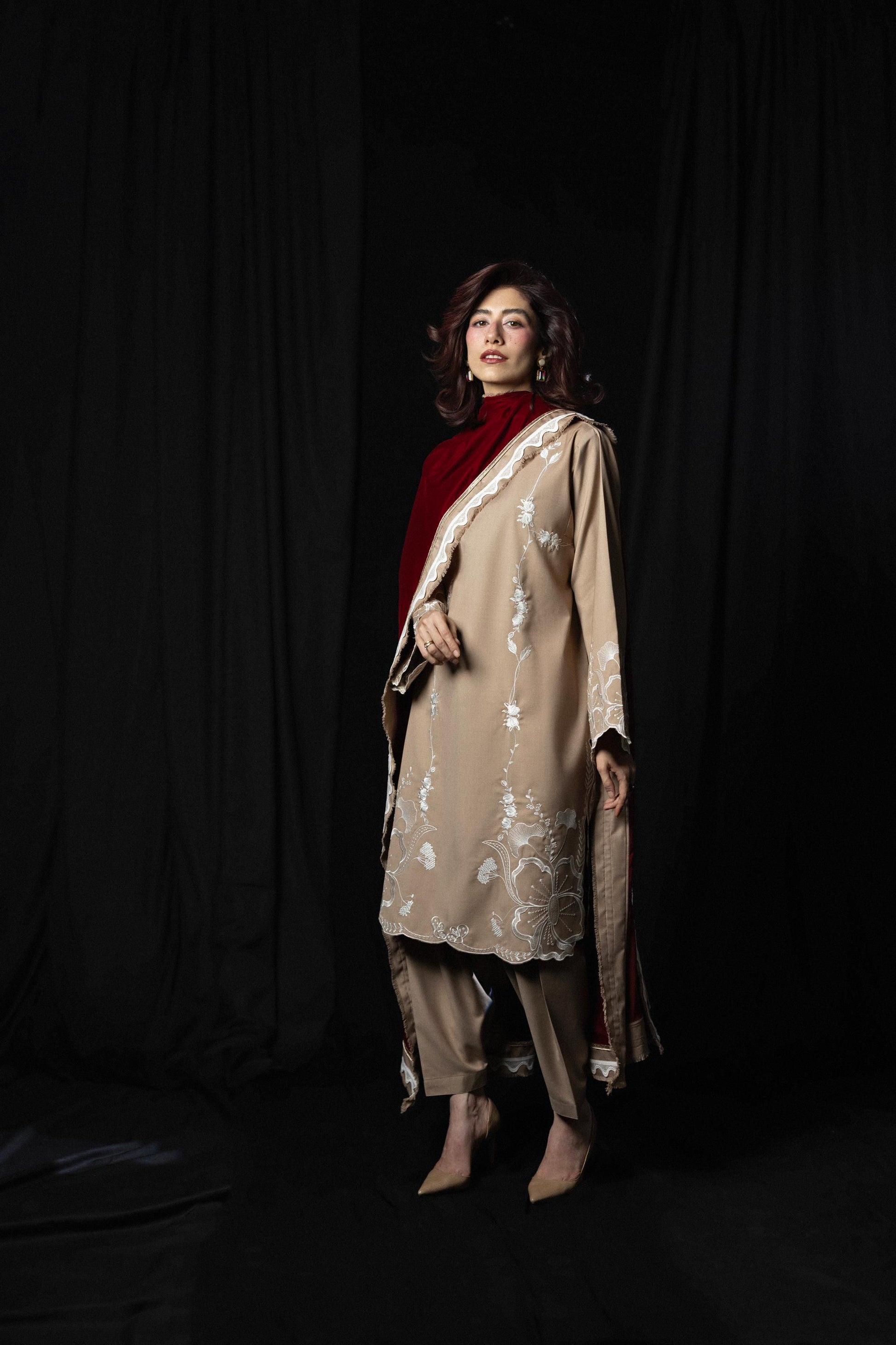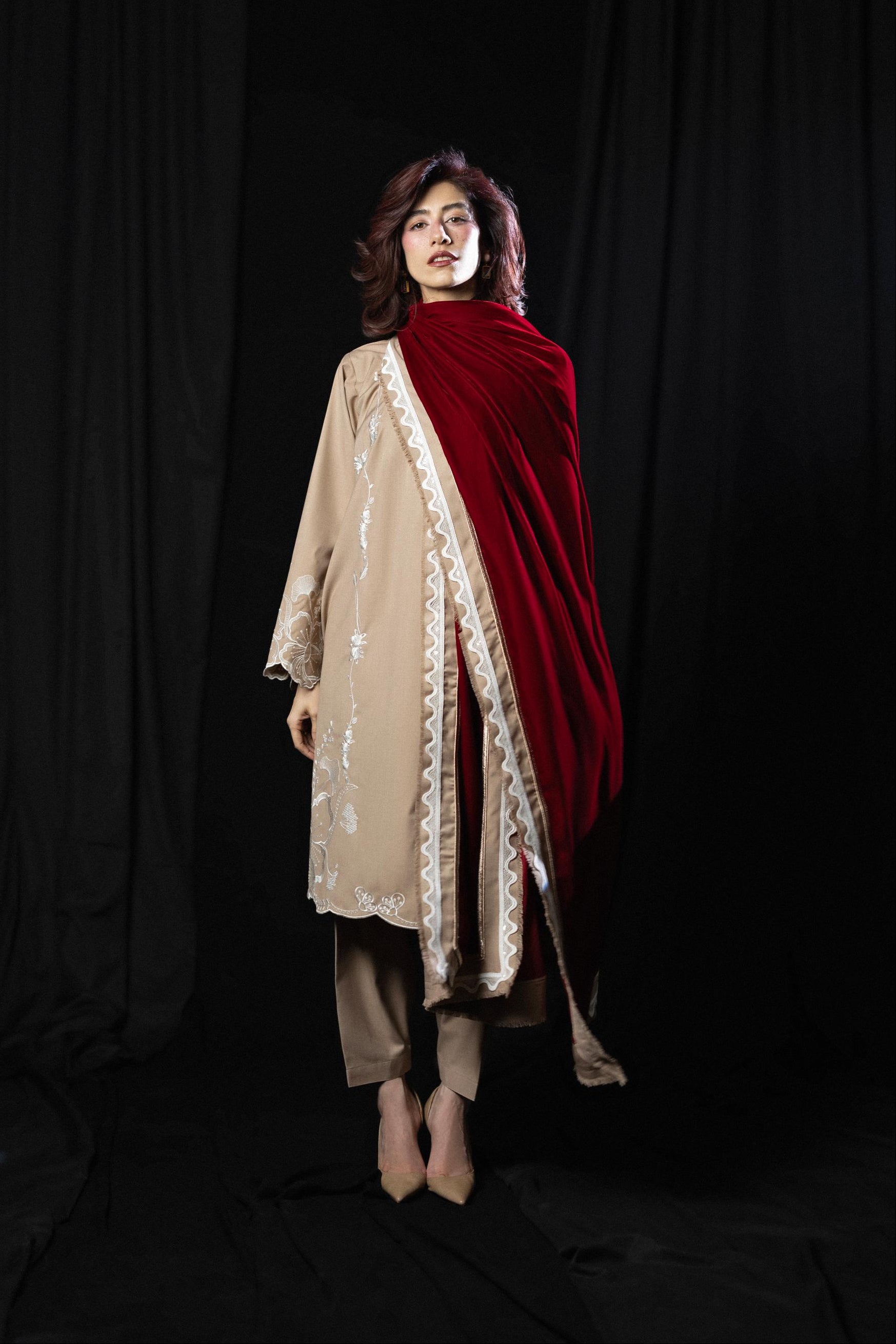 A reimagining of First Flame, translated for colder days and longer evenings. Crafted in wrinkle-resistant tropical wool suiting, the piece carries lightness beneath its structure, while white embroidery and a red velvet dupatta introduce contrast, depth, and quiet heat.