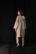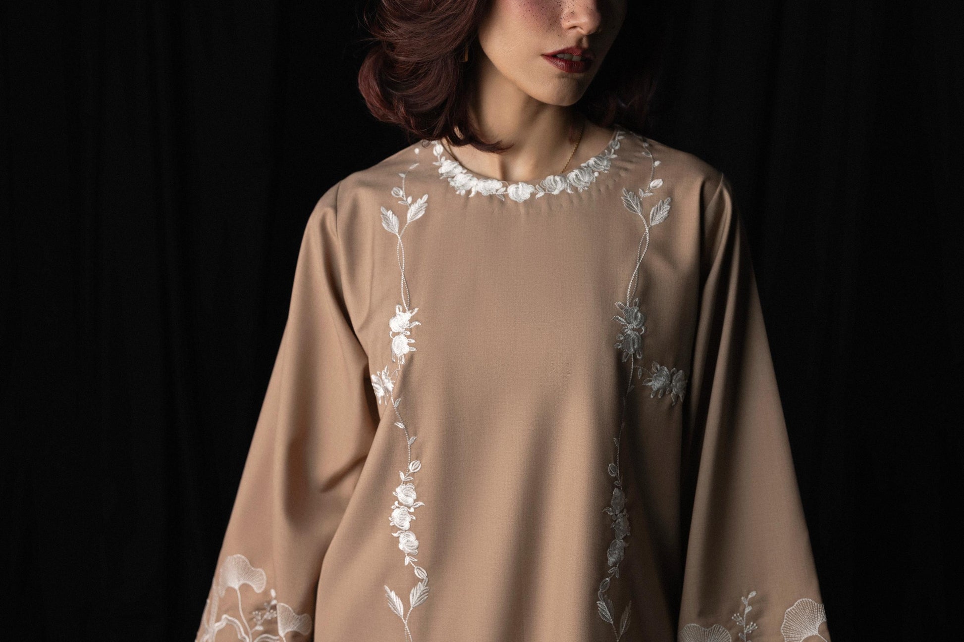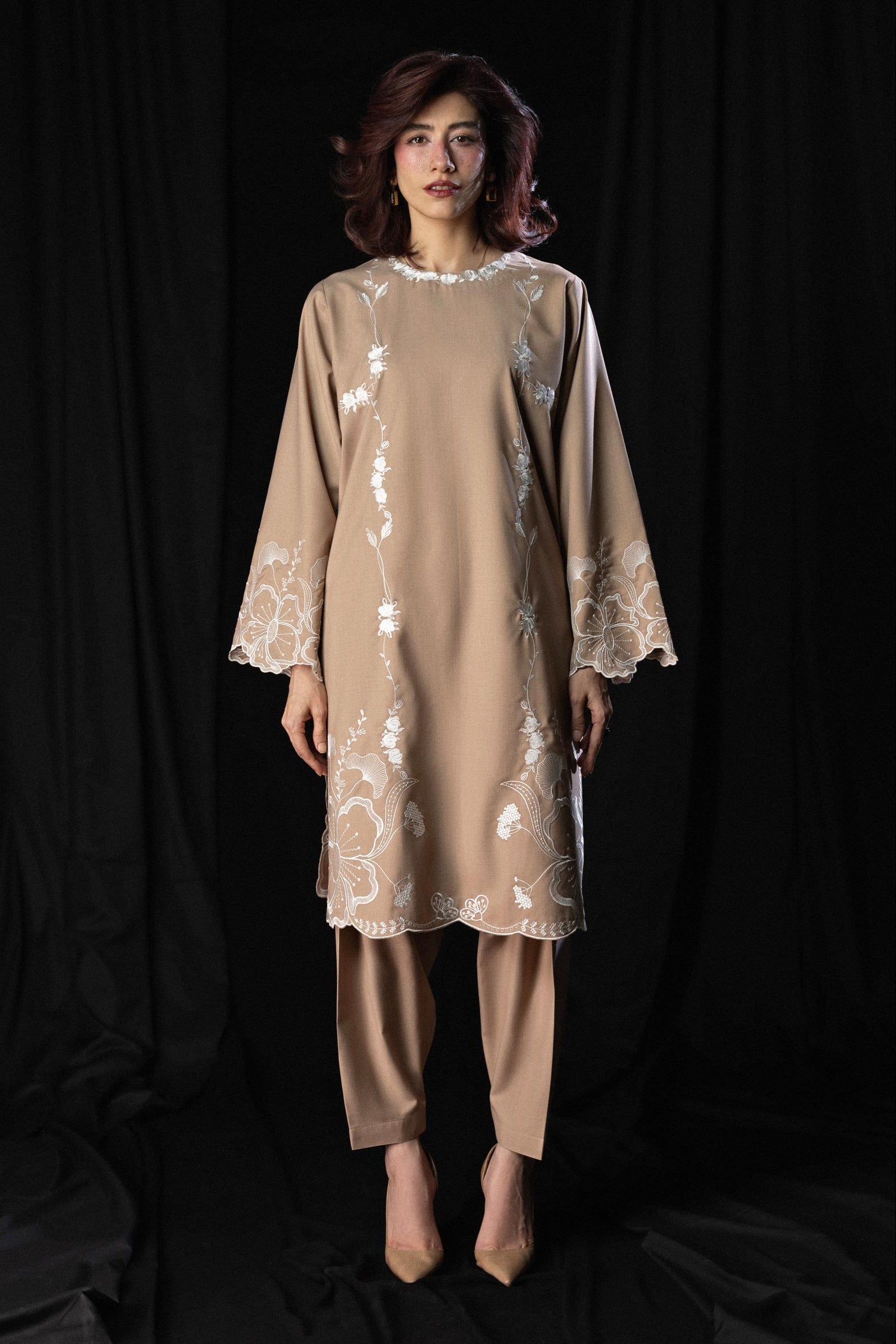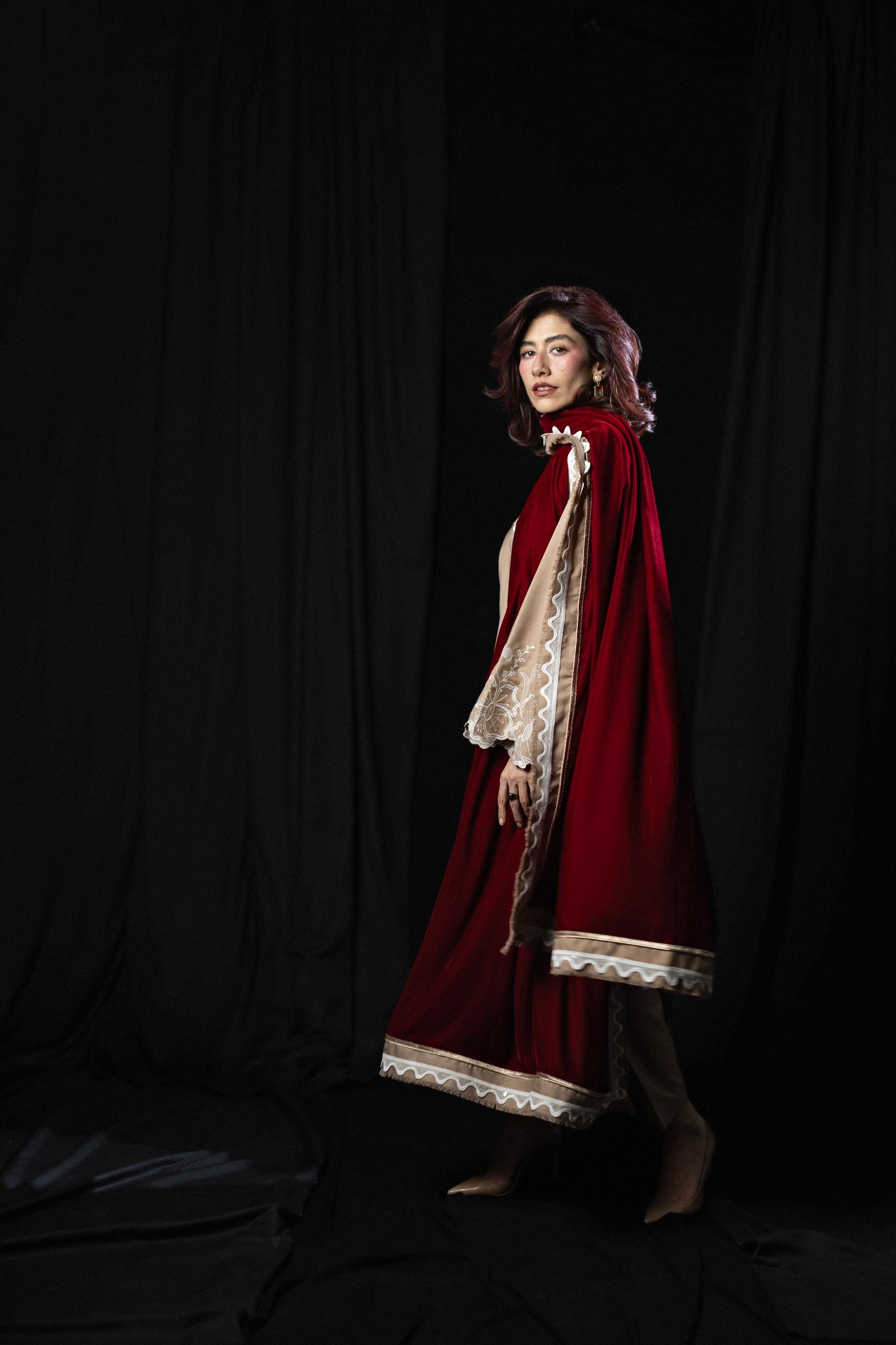 A reimagining of First Flame, translated for colder days and longer evenings. Crafted in wrinkle-resistant tropical wool suiting, the piece carries lightness beneath its structure, while white embroidery and a red velvet dupatta introduce contrast, depth, and quiet heat.